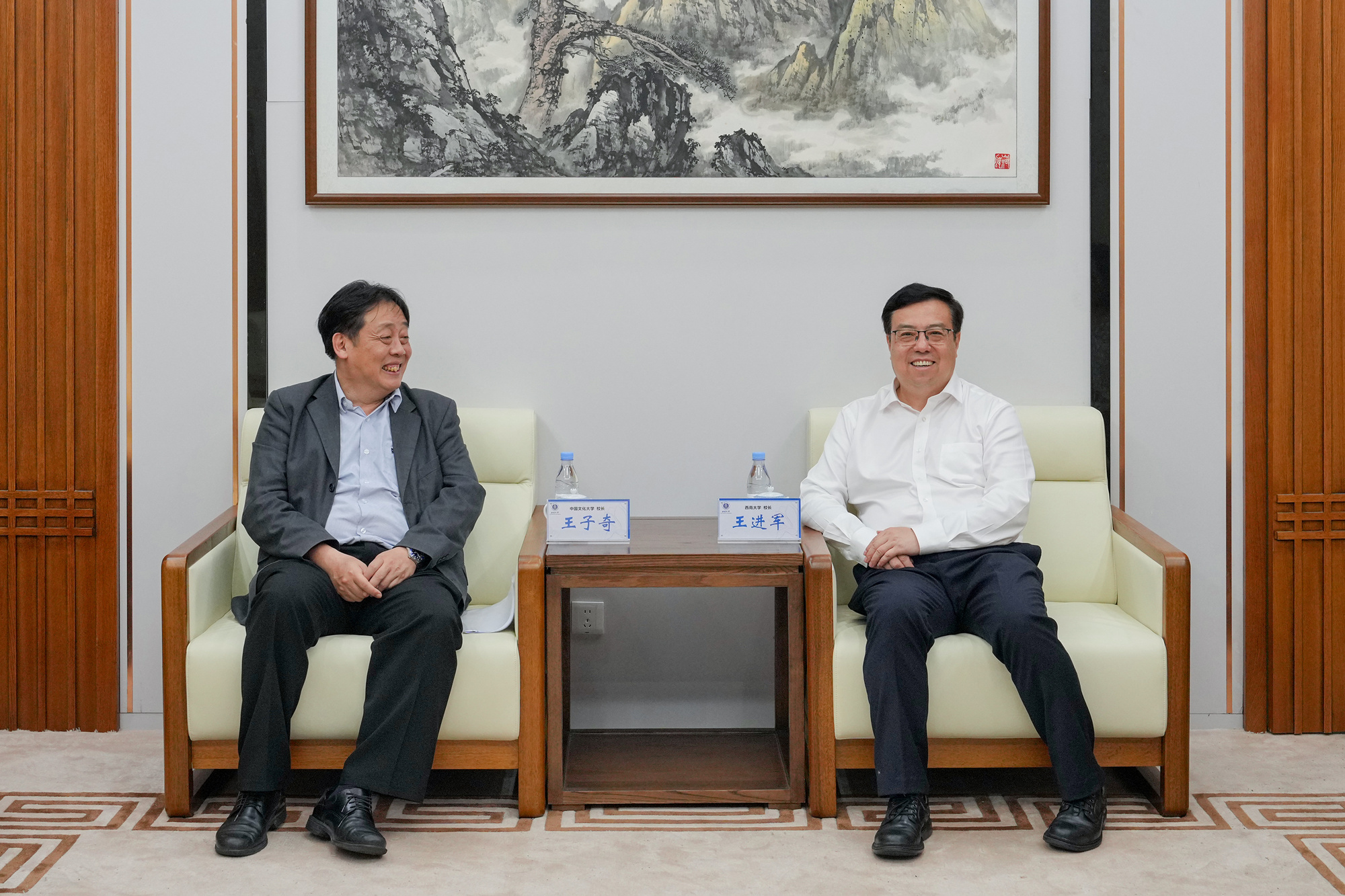 王进军热烈欢迎王子奇首次来访,简要介绍了学校基本情况,希望两校在现有合作基础上,进一步加强学生交流,增强两岸青年学子间的了解。王子奇感谢学校热情接待,表示将支持两校学生加强交流,并表明了在开展两校研究生交换项目方面的合作意向。
