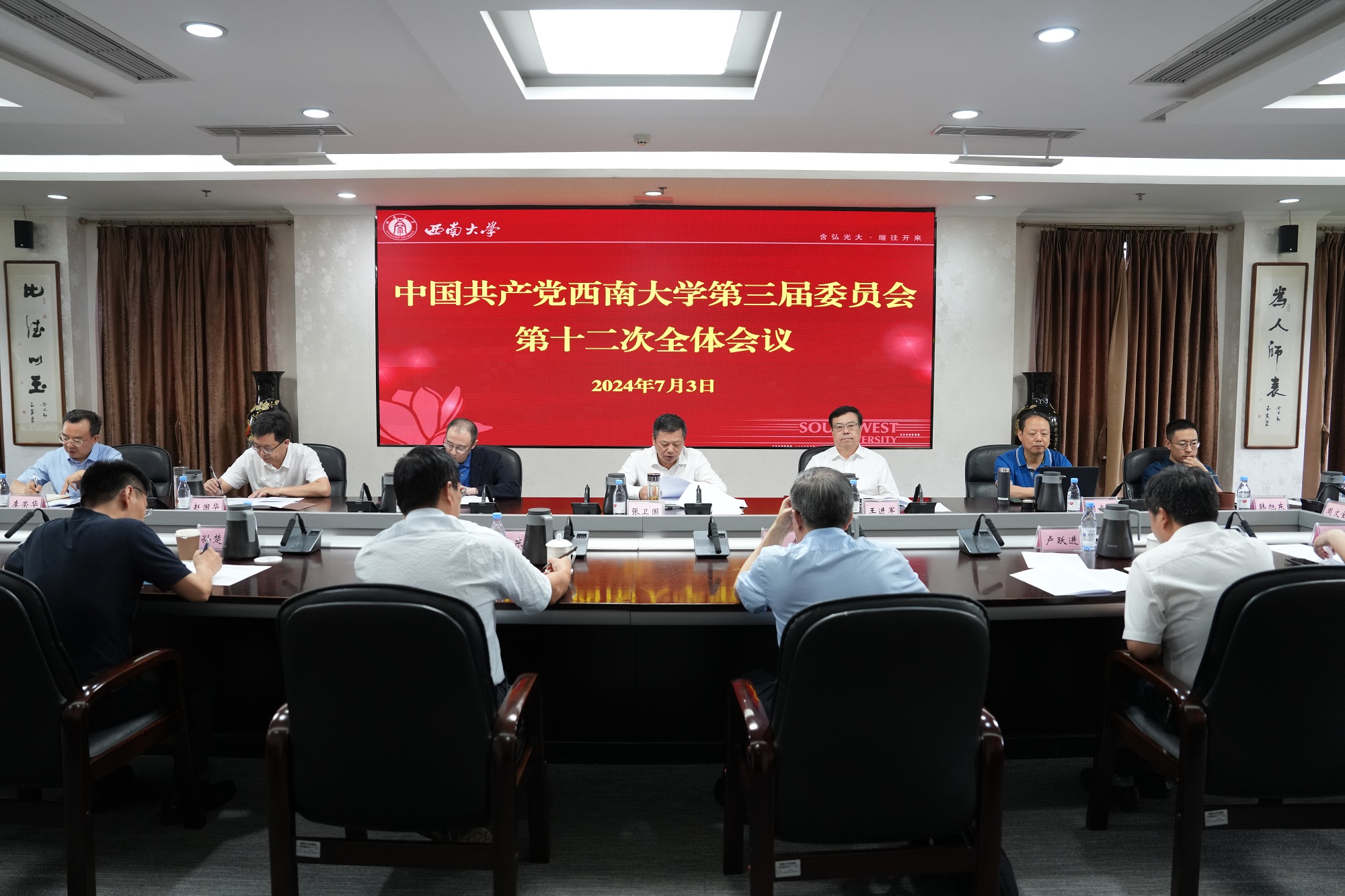 7月3日上午,中国共产党bat365正版唯一官网第三届委员会召开第十二次全体会议,全体在校校领导、党委委员出席会议。会议传达学习了6月27日中共中央政治局会议精神和习近平总书记在中共中央政治局第十五次集体学习时的重要讲话精神,听取和审议了党委书记张卫国代表党委常委会作的题为《牢记重托 勇担使命 为建设高水平研究型大学不懈奋斗》的工作报告,讨论了2024年秋季学期主要工作设想。