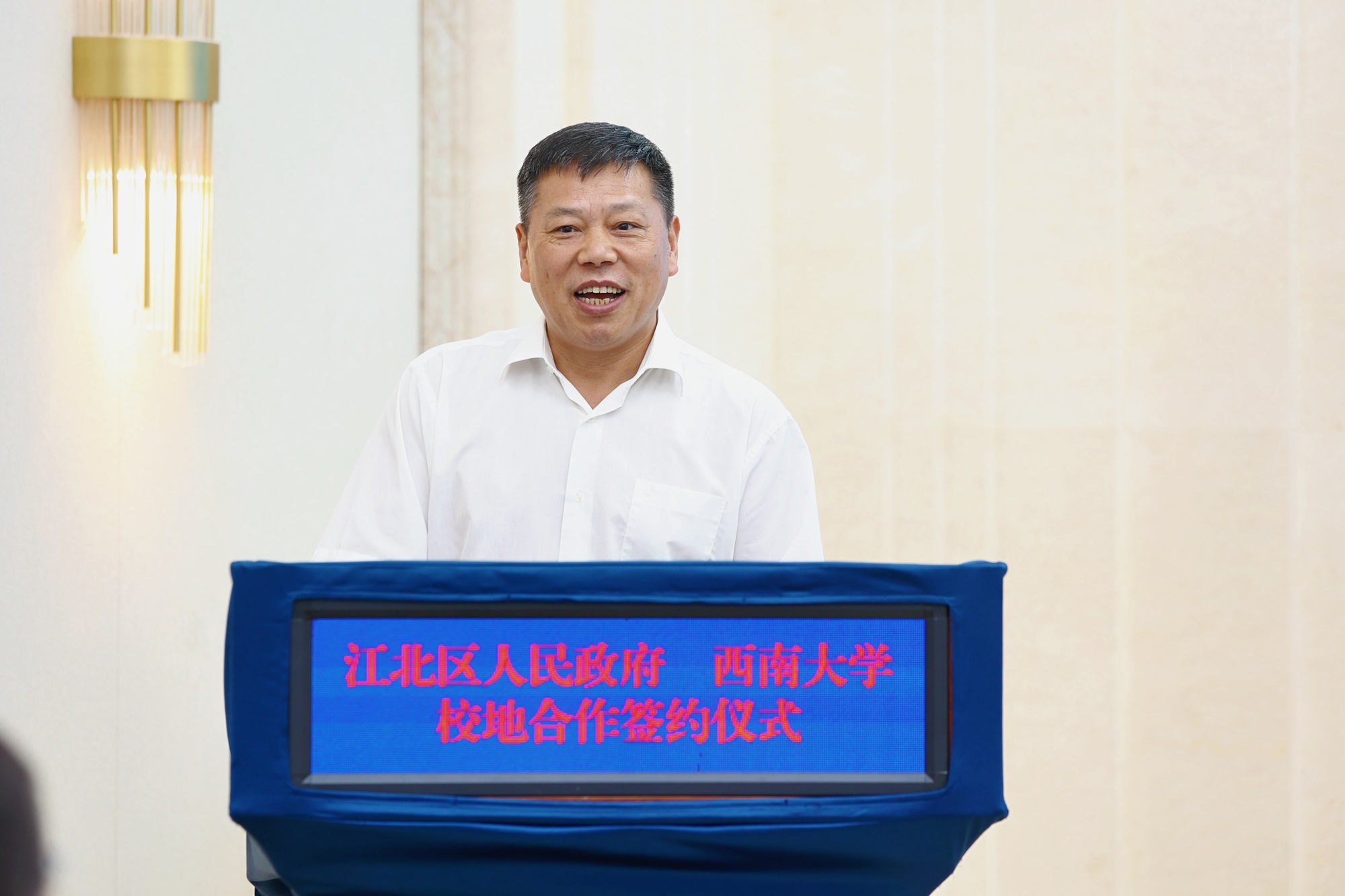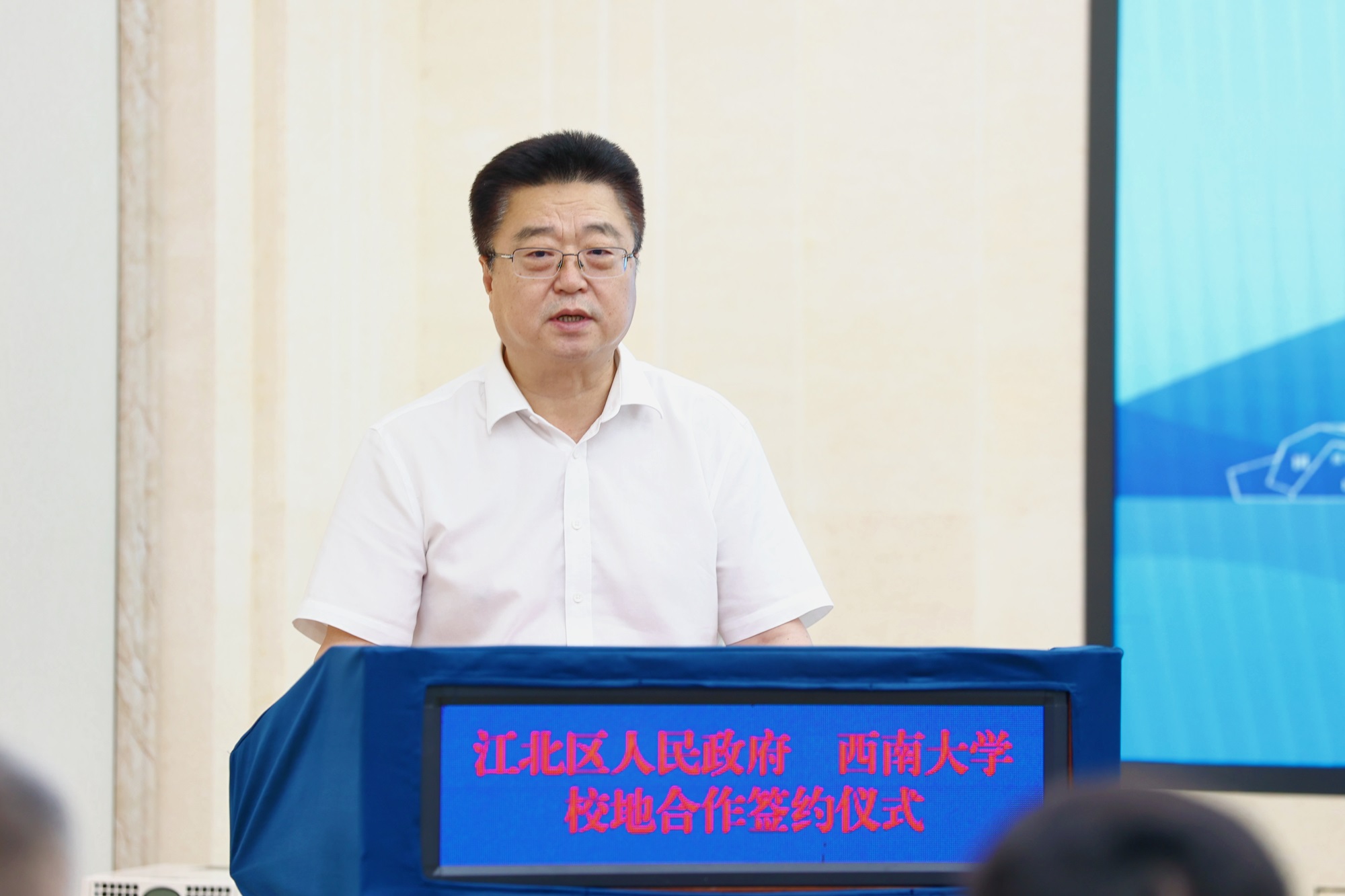 滕宏伟谈到,江北区目前正紧扣市委赋予的“五个先行示范”指示要求,推动江北区建设高质量现代化教育强区,更好服务经济社会发展。他指出,bat365正版唯一官网作为教育部直属的全国重点大学,拥有雄厚的学科实力和丰硕的科研成果,与江北区有着良好合作基础,此次战略合作必将为江北区产业发展、科技创新、人才培养注入强劲动力。他表示,江北区将持续强化校地联系,通过建立全方位对接机制,深化各行业产教融合,谱写校地合作新篇章。