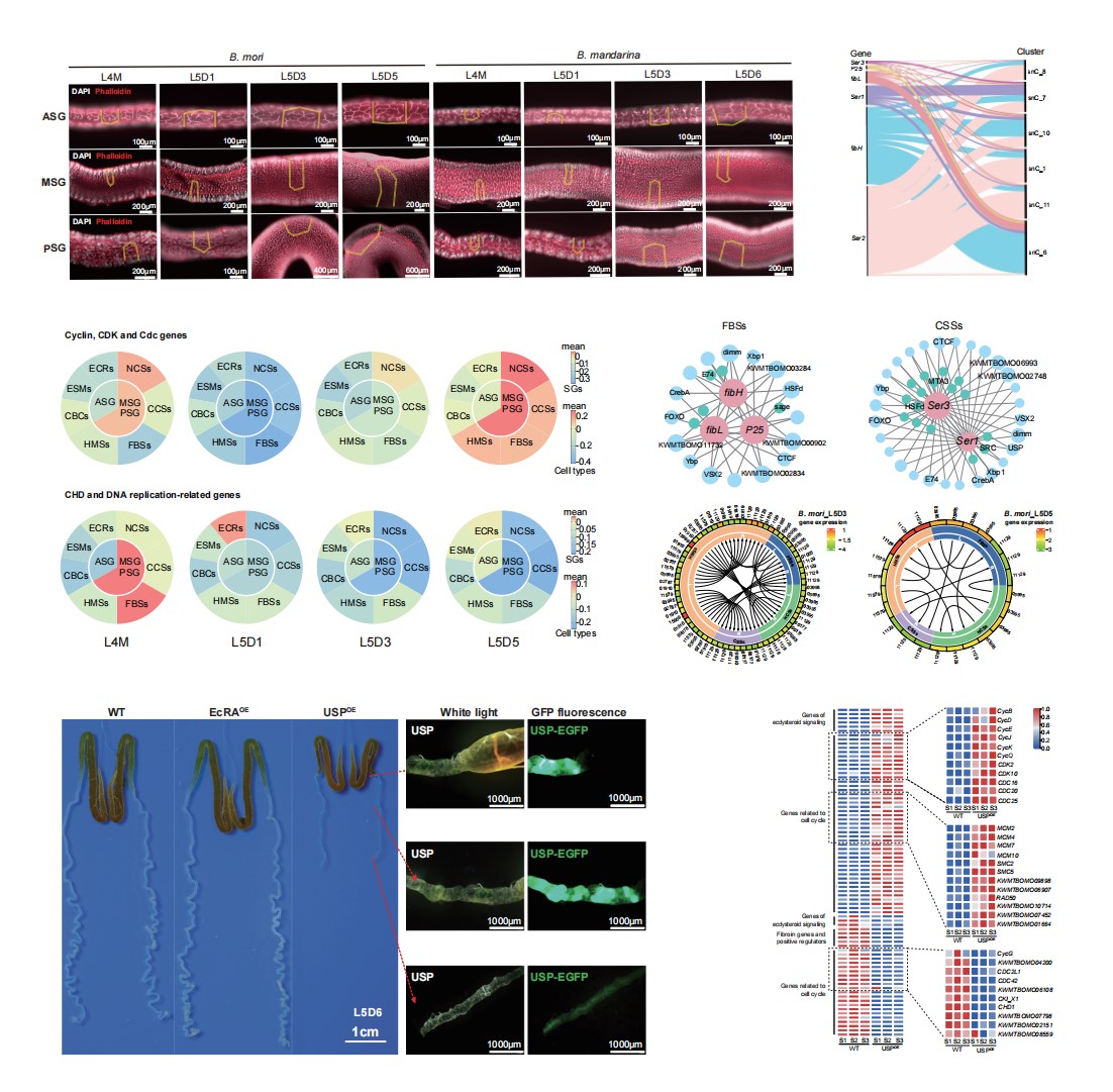 至此,课题组历时4年,绘成并解析了涵盖家蚕胚胎、稚蚕和大蚕等发育时期的丝腺单细胞蓝图和1个大蚕期家蚕丝腺空间转录图谱,为家蚕丝腺生物学和精准分子育种研究提供了理论支撑,有助于促进以家蚕为模式的泌丝生物及其丝蛋白研究与利用。