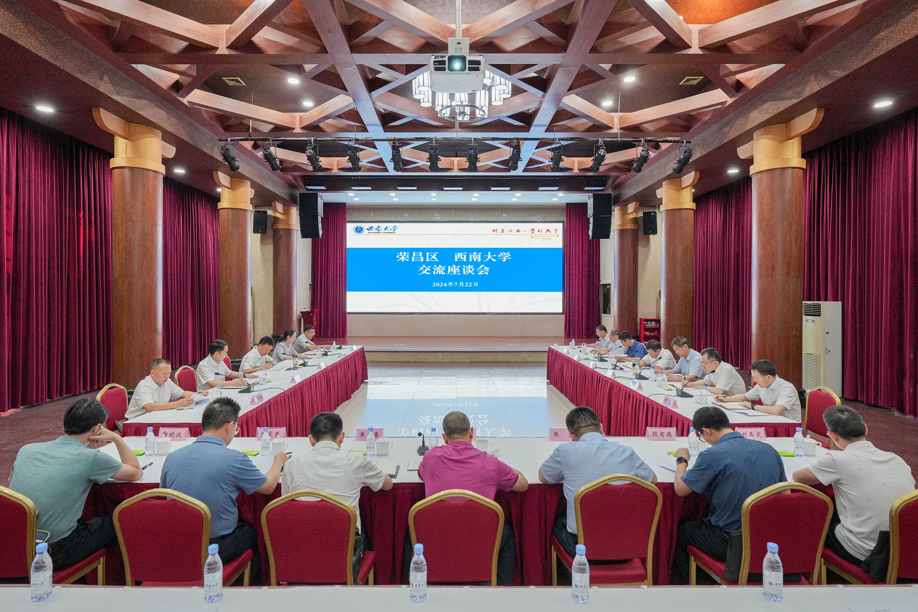 7月22日,荣昌区委书记高洪波,区委副书记、区长万容,区委副书记、组织部部长廖传锦,副区长李德伟一行来校推进区校合作。学校党委书记张卫国、党委副书记潘洵、副校长韩旭东出席交流座谈会。潘洵主持会议。
