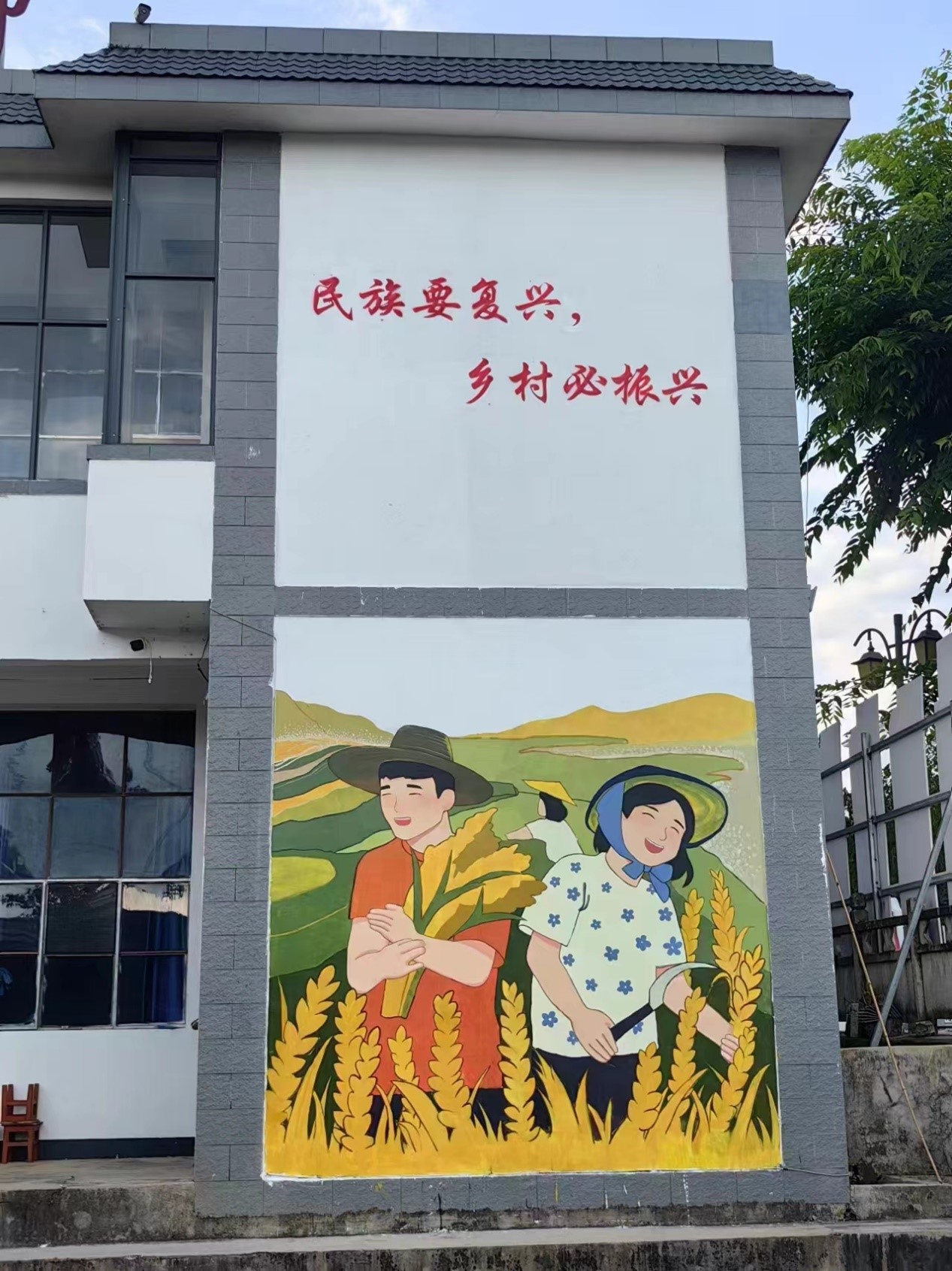 实践团成员以昌宁特色农作物云粳水稻为出发点,历时5天为新城村绘制了一幅高3.4米、宽3.0米的“新城特色”主题墙绘。人勤地丰的图像为乡村增添了饱含丰收喜悦的亮色与活力。