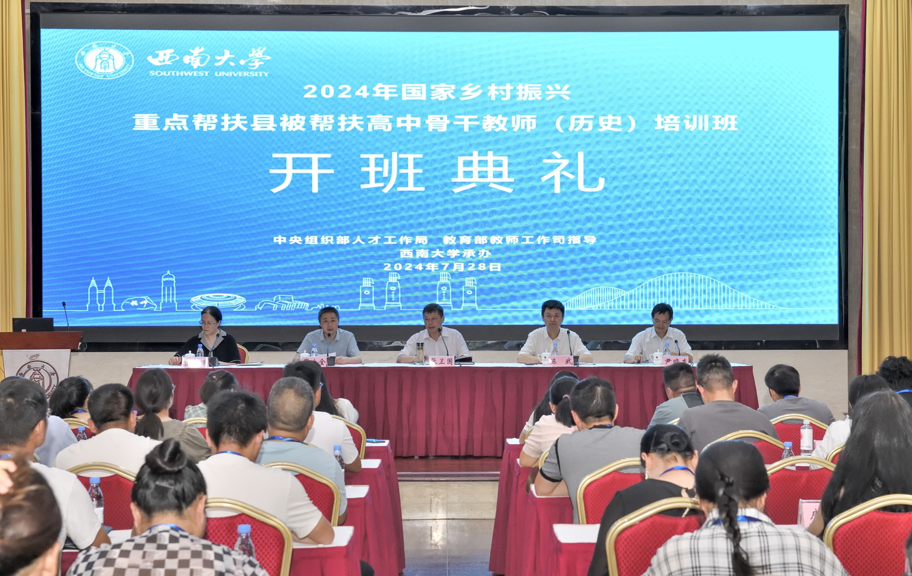 7月28日上午,学校举行2024年国家乡村振兴重点帮扶县被帮扶高中阶段骨干教师(历史)培训开班仪式。教育部教师工作司二级巡视员陈武、学校党委书记张卫国出席会议,培训与基础教育管理处处长尹晓东、教师教育学院院长罗生全,来自重庆、四川、陕西、云南、贵州、甘肃、青海、宁夏等西部地区8个省市区的114位高中骨干教师参加开班仪式。会议由罗生全主持。