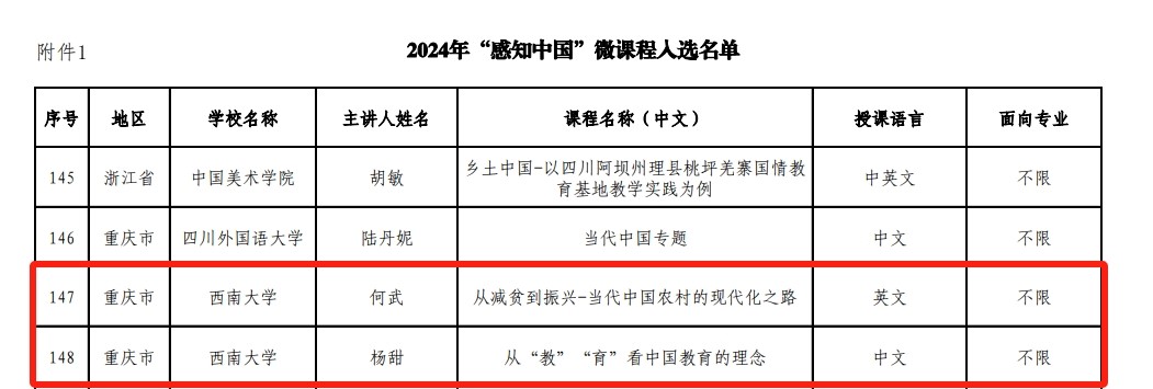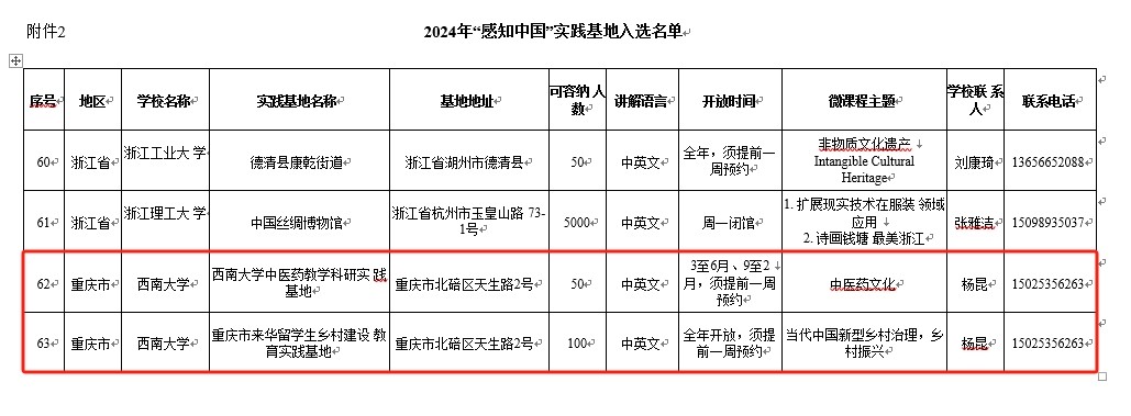 由何武教授主讲的课程“从减贫到振兴——当代中国农村的现代化之路”和杨甜副教授主讲的课程“从‘教’‘育’看中国教育的理念”成功入选国情教育微课程,“bat365正版唯一官网中医药教学科研实践基地”和“重庆市来华留学生乡村建设教育实践基地”成功获批“感知中国”社会实践基地。届时,入选的微课程将在“CSC人才在线”平台展播,获批基地将接纳市内外留学生开展国情教育及社会实践活动。