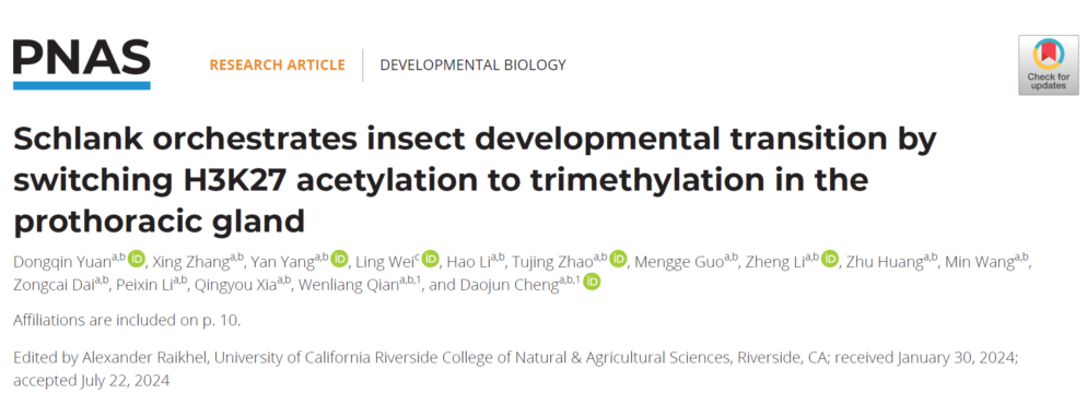 近日,bat365正版唯一官网前沿交叉学科研究院生物学研究中心程道军教授课题组在国际知名期刊《美国科学院院刊》(PNAS)在线发表了题为“转录因子Schlank通过介导前胸腺中H3K27乙酰化向甲基化修饰的转变调控昆虫变态发育”(Schlank orchestrates insect developmental transition by switching H3K27 acetylation to trimethylation in the prothoracic gland)的研究论文。该研究以家蚕和果蝇为模式,发现转录因子Schlank介导幼虫末龄阶段前胸腺细胞中发生组蛋白H3K27乙酰化修饰(H3K27ac)向三甲基化修饰(H3K27me3)转变,进而抑制保幼激素信号转导分子Hairy的转录,最终促进蜕皮激素合成与变态发育。该研究系统解析了H3K27修饰模式的变化调控昆虫发育转变的表观遗传机制。