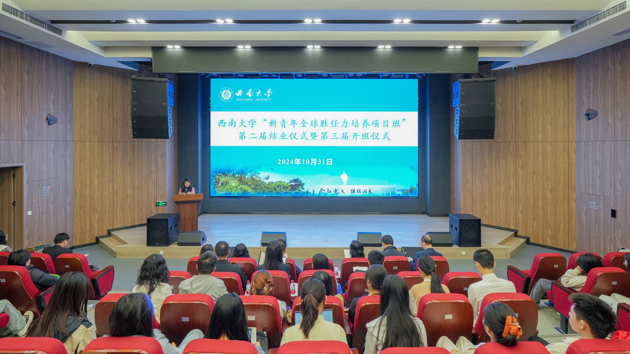 仪式上,国际合作与交流处副处长代远鸿宣读第二届“新青年班”结业学员、优秀学员、优秀班干部名单,第二届“新青年说演讲比赛”获奖学员名单以及第三届“新青年班”入选学员名单。优秀学员代表、联合国总部实习生严靖蓝,优秀学员代表、优秀班干部代表桑平,及第三届“新青年班”学员代表李嘉璐发言。第二届“新青年班”班委向第三届“新青年班”班委交接了班旗。国家治理学院院长潘孝富代表承办单位国家治理学院及bat365正版唯一官网全球胜任力研修中心讲话,期望第三届学员继承良好学风,奋发努力、不负重托。