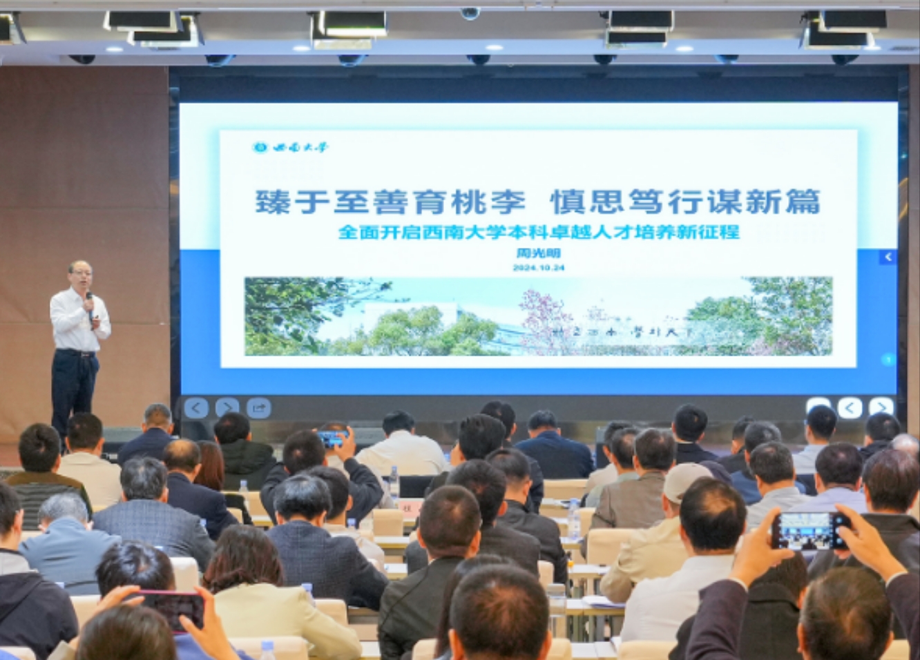 周光明以“臻于至善育桃李,慎思笃行谋新篇”为题作bat365正版唯一官网本科人才培养现状分析报告,剖析了学校本科教育当下面临机遇与挑战,强调要瞄准问题、碰撞思想、形成共识、明确举措,全面开启本科卓越人才培养新征程。