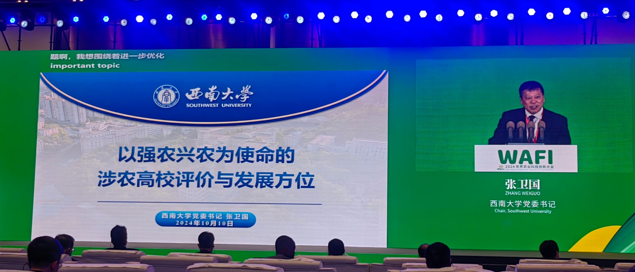 10月10日,2024世界农业科技创新大会(WAFI)世界农业高校校长论坛在北京平谷举行。党委书记张卫国应邀出席并作题为“以强农兴农为使命的涉农高校评价与发展方位”的专题报告。