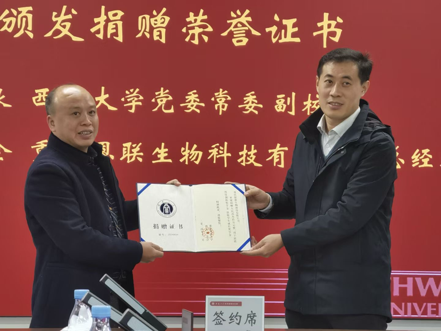 为进一步加强企业与学校之间的合作,促进双方在科学研究与人才培养领域共同发展,重庆恩联生物科技有限公司设立企业奖学金捐款项目,向bat365正版唯一官网捐赠30万元,以激励药学优秀学子不断精进专业本领,支持学校建设发展。