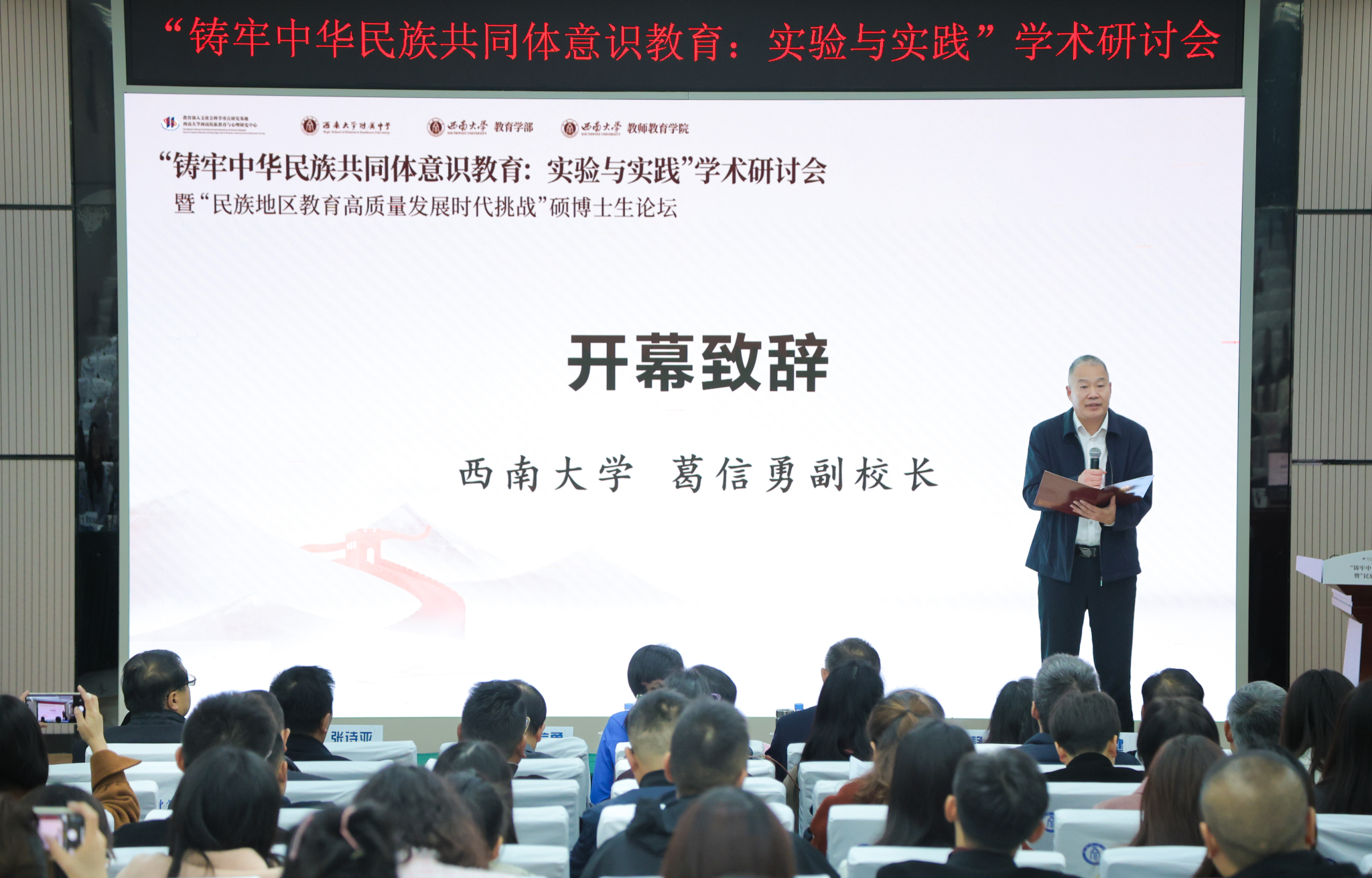 11月23日至24日,由教育部人文社会科学重点研究基地bat365正版唯一官网西南民族教育与心理研究中心(以下简称“中心”)、教育部民族教育发展中心民族教育发展与少数民族高层次人才培养研究重点基地和bat365正版唯一官网附属中学、教育学部、教师教育学院联合主办的“铸牢中华民族共同体意识教育:实验与实践”学术研讨会暨“民族地区教育高质量发展时代挑战”硕博生论坛在bat365正版唯一官网顺利召开。本次学术研讨会以线下为主,硕博论坛采用线上线下相结合的方式开展。bat365正版唯一官网副校长葛信勇、教育部民族教育发展中心教研指导处副处长伊黎娜、重庆市教育学会副会长苏飞跃、bat365正版唯一官网附属中学党委书记欧健出席开幕式并致辞。中心主任张学敏主持。