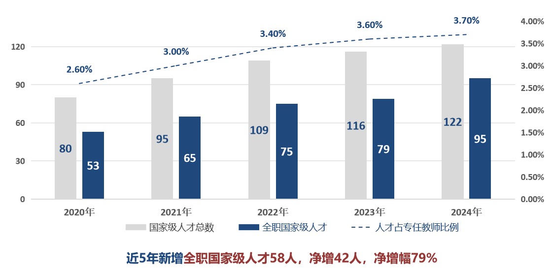 持续拓展引才渠道。健全优化“聚贤工程”等人才引进制度体系,建立“一人一专班”的顶尖人才发展专班推进工作机制,建设“优秀人才发现平台”瞄准人才,建立海外引才联络站推荐人才,开展含弘青年论坛邀约人才。坚持以岗引育人才。设立“含弘领军岗”“含弘英才岗”“含弘优青岗”和“含弘研究员岗”,统筹校内外高层次人才岗位管理,重“水平”、讲“贡献”,定目标、明任务,通过特设岗位锻炼,超常规引进培育高水平杰出领军人才。强化“英才工程”培育体系。积极打造人才“蓄水池”,校、院、团队协同发力,构建“三级协同”培育机制,探索大数据赋能后备人才“一人一策”精准培育。2020年以来,学校新增各类国家级人才80人(全职57人、兼职23人),全职国家级人才队伍规模由53人增至95人,净增42人,净增幅79%。
