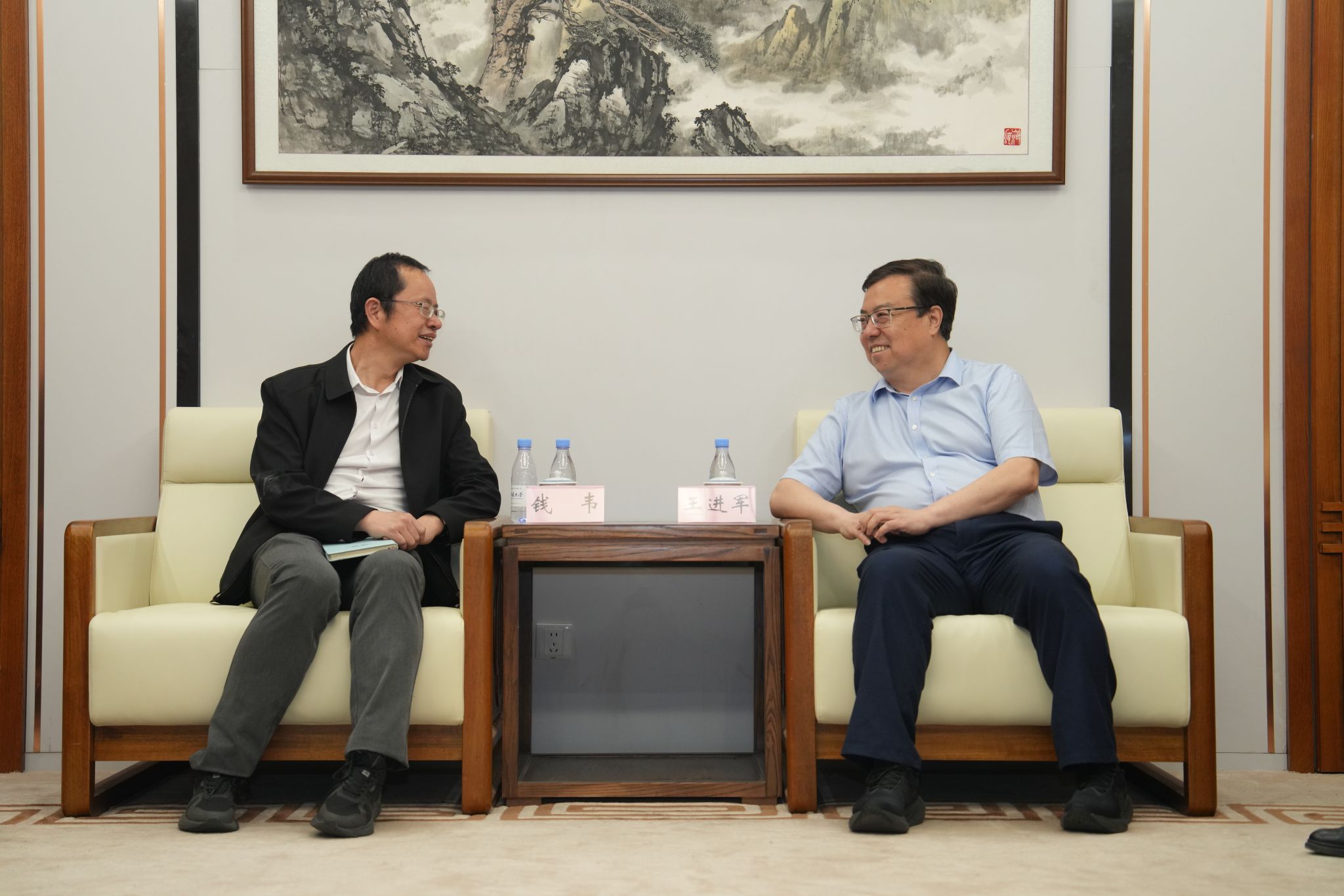 上午,校长王进军、副校长邹芙都会见了钱韦一行。王进军对钱韦一行的到来表示欢迎。他表示,双方已在科学研究、人才培养、学术交流等领域开展了全方位、多层次的深度合作,建立了深厚情谊,希望在此基础上持续深化合作,共筑人才培养新高地、共拓科研合作新空间、共建协同发展新生态,打造高校与科研院所深度合作的典范。
