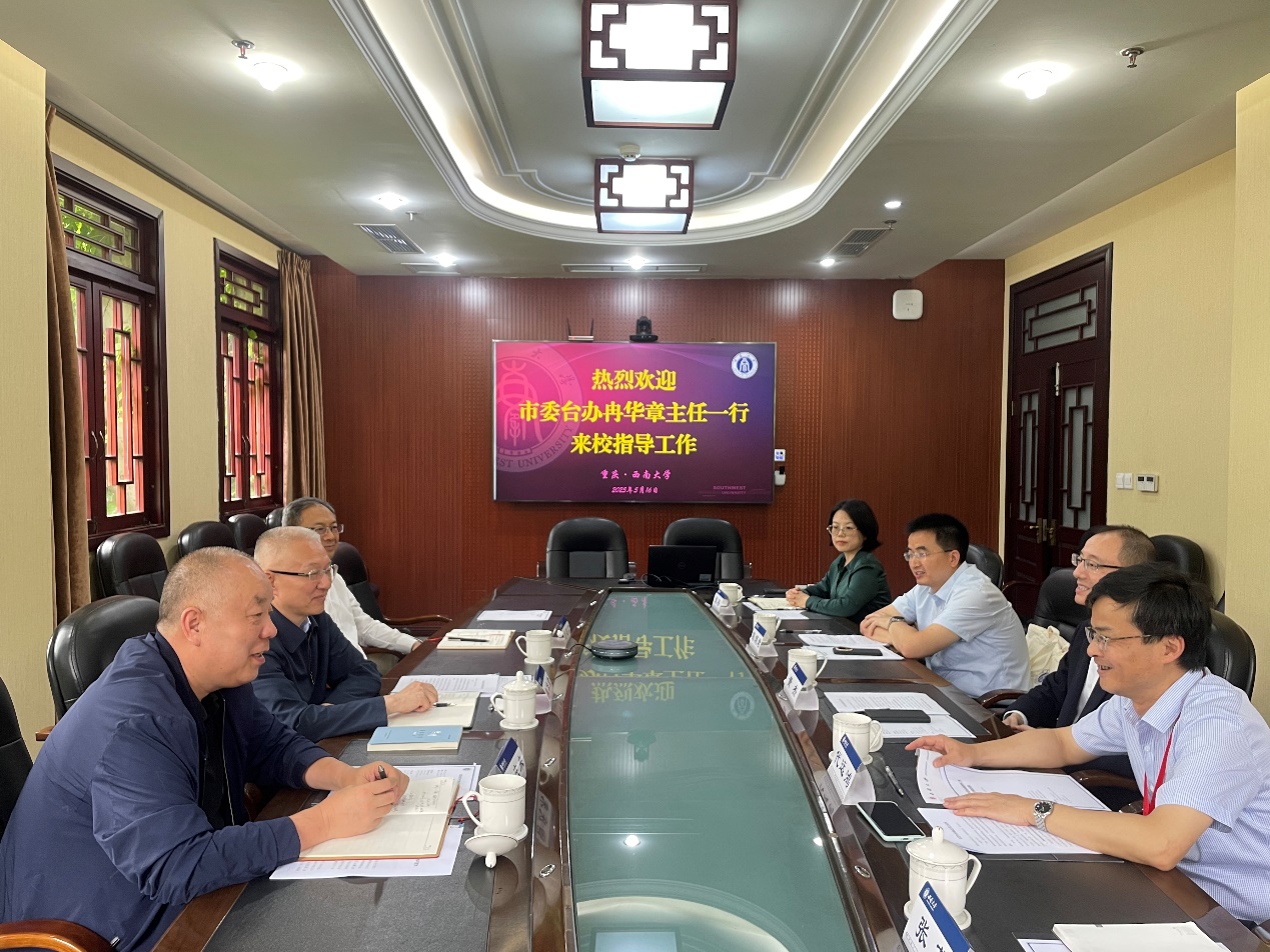 5月16日,中共重庆市委台湾工作办公室(以下简称“市委台办”)主任冉华章、副主任刘建南、交流处处长曾庆来一行来校指导对台工作。学校党委副书记黄杰出席座谈会,港澳台办公室负责人及相关工作人员参加会议。