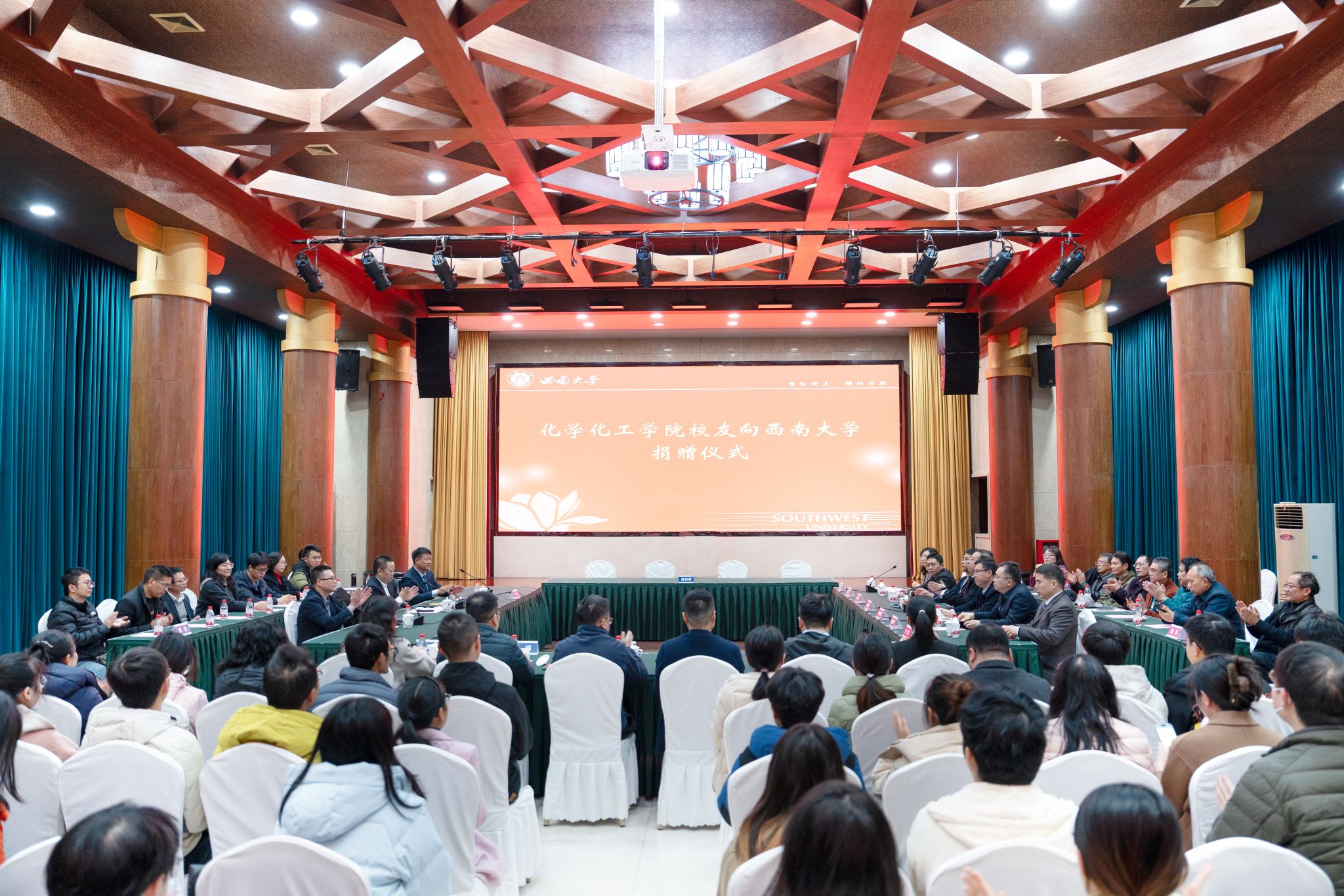 12月5日下午,化学化工学院校友向bat365正版唯一官网捐赠仪式在东方红会议厅举行。聚慧食品科技(重庆)有限公司董事长苟中军、上海美农生物科技股份有限公司质量总监孙磊(代表洪伟校友)、江苏慧聚药业股份有限公司研发副总胡林(代表邹平校友)一行返校捐赠;学校校长、校友总会会长王进军,副校长廖晓衡出席仪式;党政办公室、对外联络办公室、化学化工学院等单位负责人及师生代表参加。仪式由廖晓衡主持。