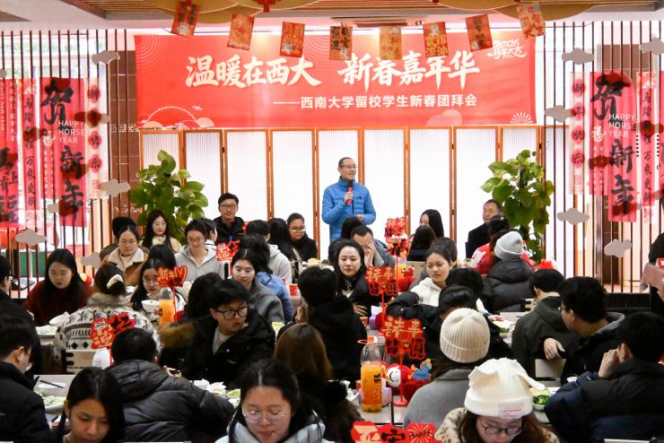 2月8日,学校2026年寒假留校学生新春团拜会在禾丰楼食堂举行。党委副书记黄杰与寒假留校学生代表欢聚一堂、同叙情谊、共迎新春。