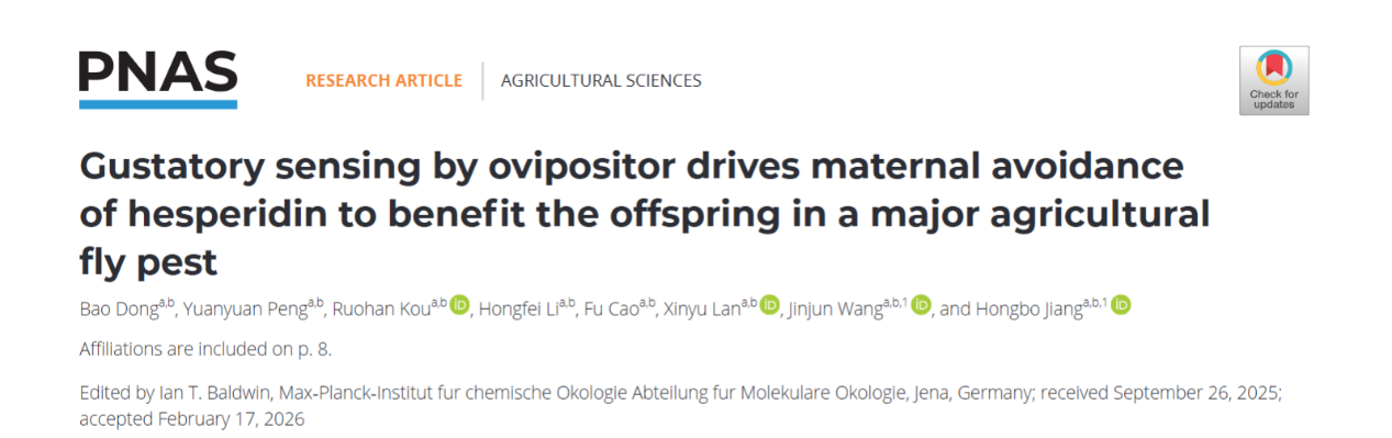 日前,学校植物保护学院王进军教授/蒋红波教授团队以“橘小实蝇—芒果”互作体系为模型开展研究,首次揭示橘小实蝇雌虫将产卵器作为味觉感受器官,通过感知果实内部化学信号作出有利于后代生长发育的产卵决策机制。相关成果以《基于产卵器味觉感受的橘小实蝇雌虫对橙皮苷回避行为及其子代适应性获益机制》(Gustatory sensing by ovipositor drives maternal avoidance of hesperidin to benefit the offspring in a major agricultural fly pest)为题,发表于国际学术期刊《美国国家科学院院刊》(PNAS)。