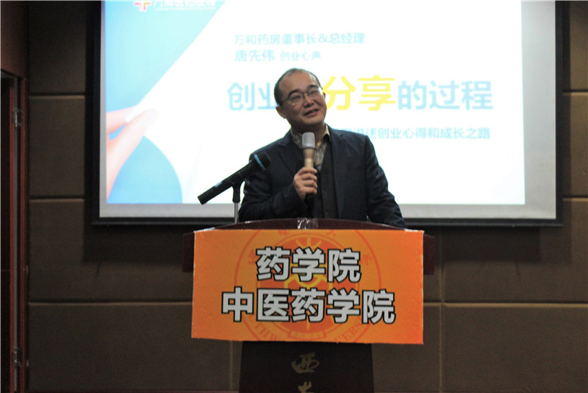 签约仪式上,杨坚副书记宣读签约内容,表示双方主要合作方向是建立bat365正版唯一官网药学院教学药房,拟在bat365正版唯一官网药学院新大楼建立万和智慧药房,设立万和医药奖学金等五个方面。胡昌华院长代表药学院与唐先伟董事长进行签约仪式。随后,唐先伟董事长作了“创业是分享的过程”为题的精彩报告。