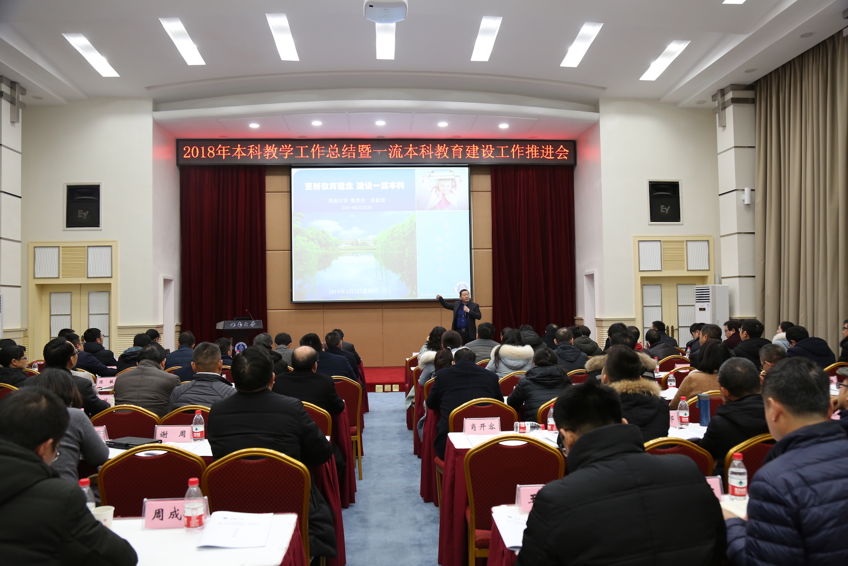 2018年本科教学工作总结暨一流本科教育建设工作推进会1月3日在桂园宾馆金桂厅召开。会议邀请了原厦门大学副校长邬大光教授作主题报告,bat365正版唯一官网副校长靳玉乐出席会议并讲话,各学院(部)分管本科教学工作副院(部)长、各专业负责人,党委宣传部 党委网络工作部、团委、教务处等职能部门负责人参加会议。会议由靳玉乐副校长主持。