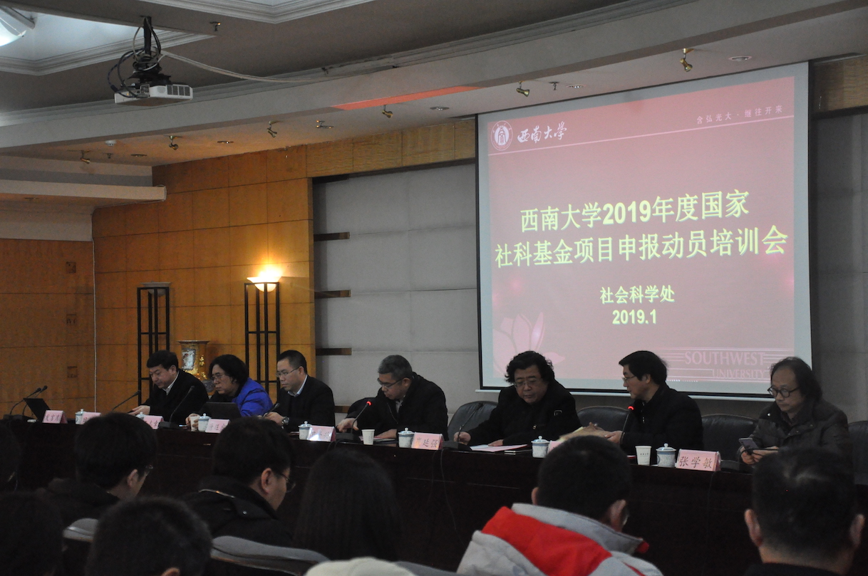 2019年度国家社科基金项目项目申报工作已全面启动,为准确把握国家社科基金项目的选题精神和论证规范,提高项目申报质量,学校于1月9日在田家炳教育书院八楼举办“2019年度国家社科基金项目申报动员培训会”。出席动员培训会的有重庆市社科联党组成员阳奎兴副主席,bat365正版唯一官网副校长崔延强,重庆市社科规划办主任唐旺虎,bat365正版唯一官网经济管理学院王志章教授、西南民族教育与心理研究中心主任张学敏、bat365正版唯一官网历史文化学院田阡教授。学校从事人文社会科学研究的广大科研人员、拟申报2019年度人文社科基金项目的科研人员、文科单位主管科研的领导和科研秘书共200余人参加了会议。会议由社科处处长刘义兵主持。