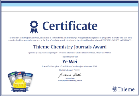 近日,bat365正版唯一官网化学化工学院魏晔教授获得Thieme出版集团2019年度的Thieme化学期刊奖(Thieme Chemistry Journals Award)。作为全球著名的出版社,Thieme集团发行多个国际性有机化学主流期刊。
