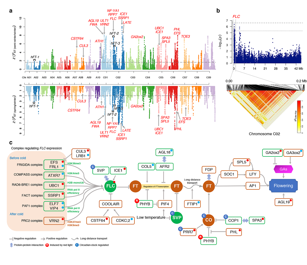 甘蓝型油菜是由白菜和甘蓝通过种间杂交后染色体自然加倍而成的异源四倍体。由于白菜和甘蓝均有多个亚种,且甘蓝型油菜野生种群尚无报道,导致甘蓝型油菜的起源和进化历史研究进展缓慢。李加纳教授团队利用588份世界各地代表性材料进行了基因组重测序,结合王晓武团队318份白菜和甘蓝重测序数据,开展了油菜群体基因组研究。综合系统发育、PCA、LD、结构分析和地理演化分析结果,揭示了甘蓝型油菜A亚基因组可能起源于白菜亚种欧洲芜菁的祖先,C亚基因组可能来源于4种现代甘蓝未分化前的祖先。地理演化分析发现两个祖先种在近1000年内有大量基因渗入到油菜;并证实了其形成初期为油用冬油菜。选择信号分析揭示了防御相关基因和开花基因的亚基因组非平衡选择,对油菜形成后的初期环境适应及种植范围扩展具有重要意义。结合GWAS、LD、转录组和选择信号分析,研究还鉴定了与油菜品质改良、产量提升和生态型改良相关的多个重要分子标记和功能基因,对油菜开展全基因组选择育种和基因工程改良具有重要意义。
