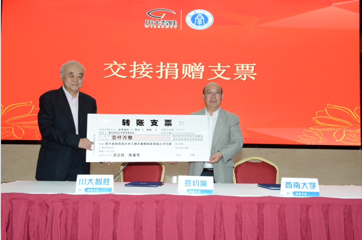 在仪式上,游志胜先生与其夫人陈素华女士以个人名义向bat365正版唯一官网捐赠1000万元人民币,用于资助学校三维大数据相关领域的人才引进。这将助力学校相关领域的科研工作迈上更高的台阶。陈素华女士是原西南师范学院数学系65级校友,这份捐赠也表达了她对母校的感恩之情。