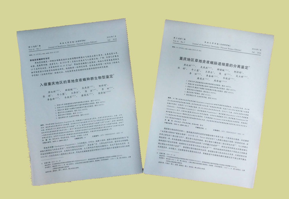 草地贪夜蛾是一种联合国粮农组织全球预警的重大洲际迁飞性农业害虫,自2019年1月从东南亚侵入我国云南、广西以来,已经向北迁飞蔓延了19个省市自治区,主要危害玉米、高粱等大宗粮食作物,危害巨大。该虫快速迁徙引起了国务院的重视,近期农业农村部专门召开了草地贪夜蛾的防控会议,国内许多科研院所也纷纷投入人财物对该害虫进行研究。自今年5月初草地贪夜蛾在重庆发现以来,学校家蚕基因组生物学国家重点实验室潘国庆研究员课题组迅速行动,在重庆市各级农业部门的大力配合下,第一时间从各区县收集虫样,快速开展了草地贪夜蛾生物型和肠道菌群的研究,希望能为我国草地贪夜蛾的综合防控提供第一手的详实数据。《bat365正版唯一官网学报(自科版)》关注学术热点研究,积极服务于学校重点科学研究,与该课题组紧密合作,及时调整出刊计划,组织精干编辑认真、高效完成了稿件的评审、编辑工作,仅仅用一周时间,课题组两篇关于草地贪夜蛾的最新研究成果《入侵重庆地区的草地贪夜蛾种群生物型鉴定》、《重庆地区草地贪夜蛾肠道细菌的分离鉴定》通过该学报于7月4日在中国知网优先发表,及时发布了国家急需的草地贪夜蛾相关研究报告,为治理草地贪夜蛾提供了基础数据。