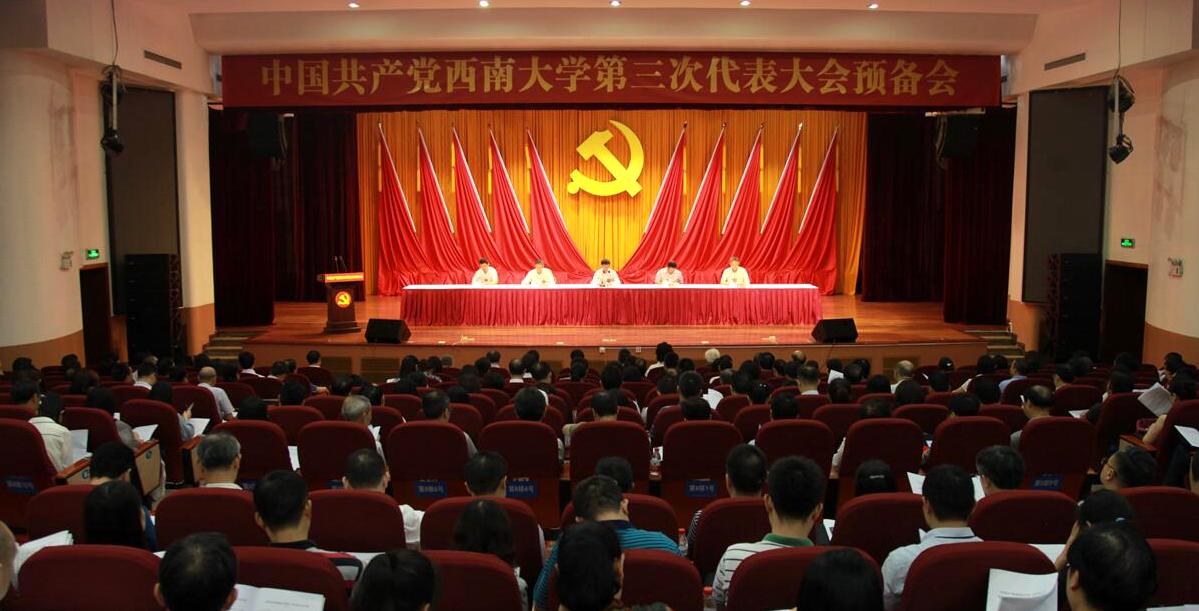 7月10日下午,中国共产党bat365正版唯一官网第三次代表大会预备会议在音乐学院演奏厅举行。党委书记李旭锋同志,党委副书记、校长张卫国同志,党委副书记安春元同志,党委副书记、纪委书记李华同志,党委副书记潘洵同志在主席台就坐,全体党代表参加会议。会议由李旭锋同志主持。