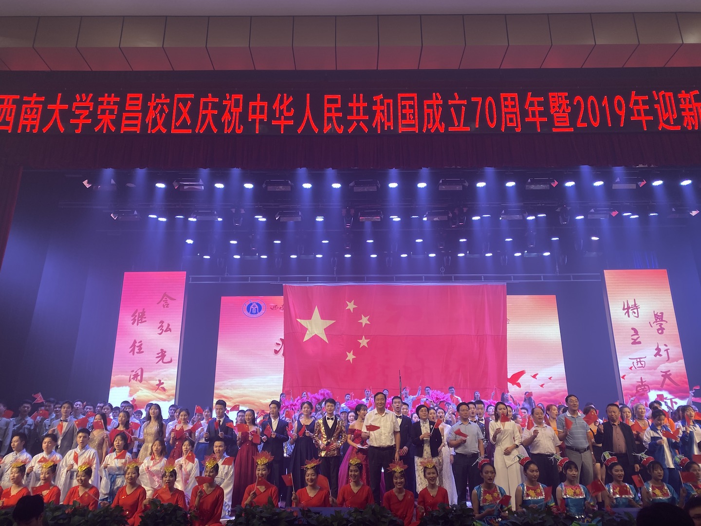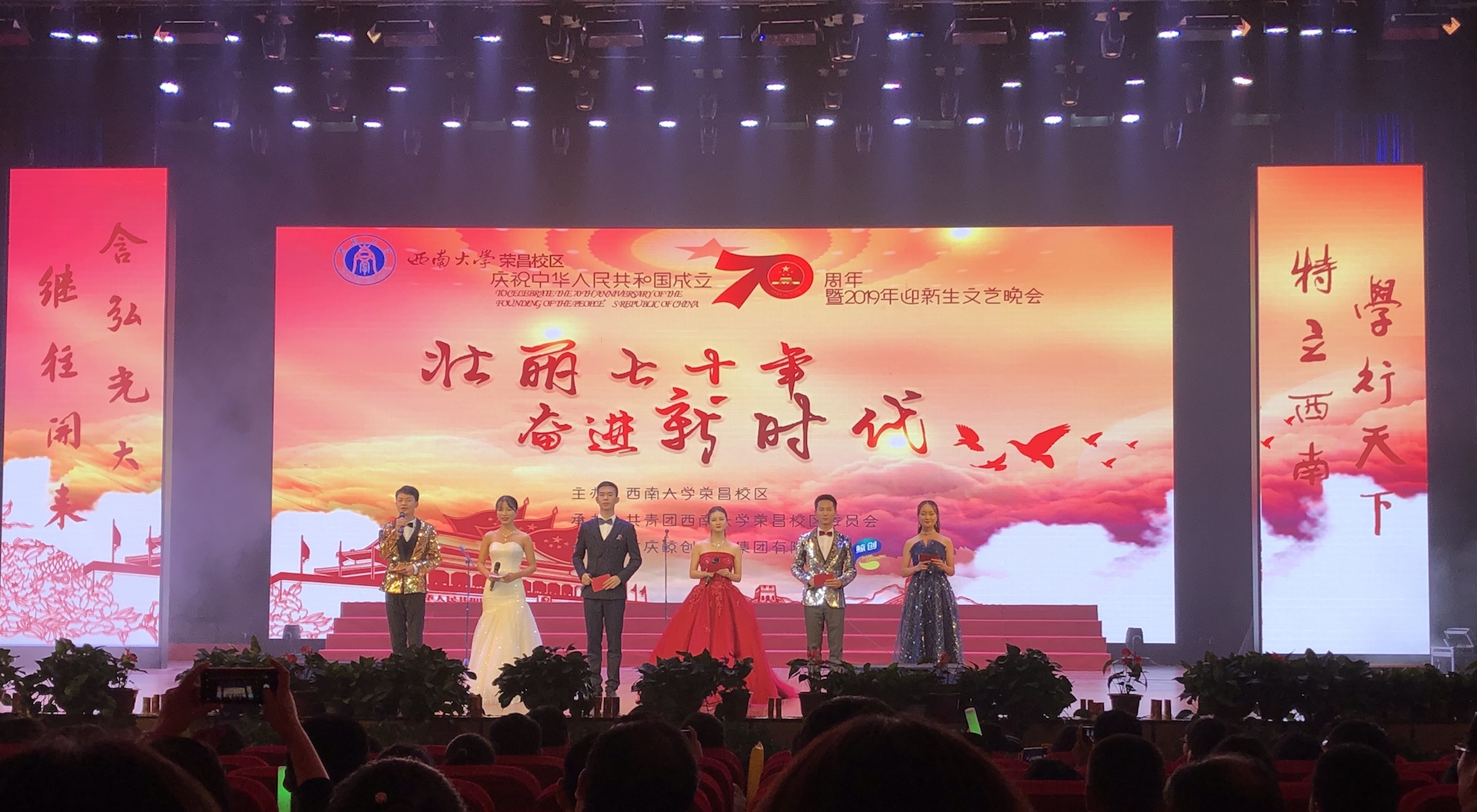 70年励精图治,叠浪潮涌,我们不忘初心;70年时光飞渡,岁月如歌,我们牢记使命。9月28日,“壮丽七十年,奋进新时代---bat365正版唯一官网荣昌校区庆祝中华人民共和国成立70周年暨2019年迎新生文艺晚会”在校区新活动中心举行。荣昌区委副书记黄晏、荣昌区相关职能部门、学校相关职能部门、荣昌校区、动物科学学院、商贸学院、荣昌校区基础部、荣昌校区各职能部门主要负责同志出席晚会,校区2019级新生共计1300余人参加晚会。