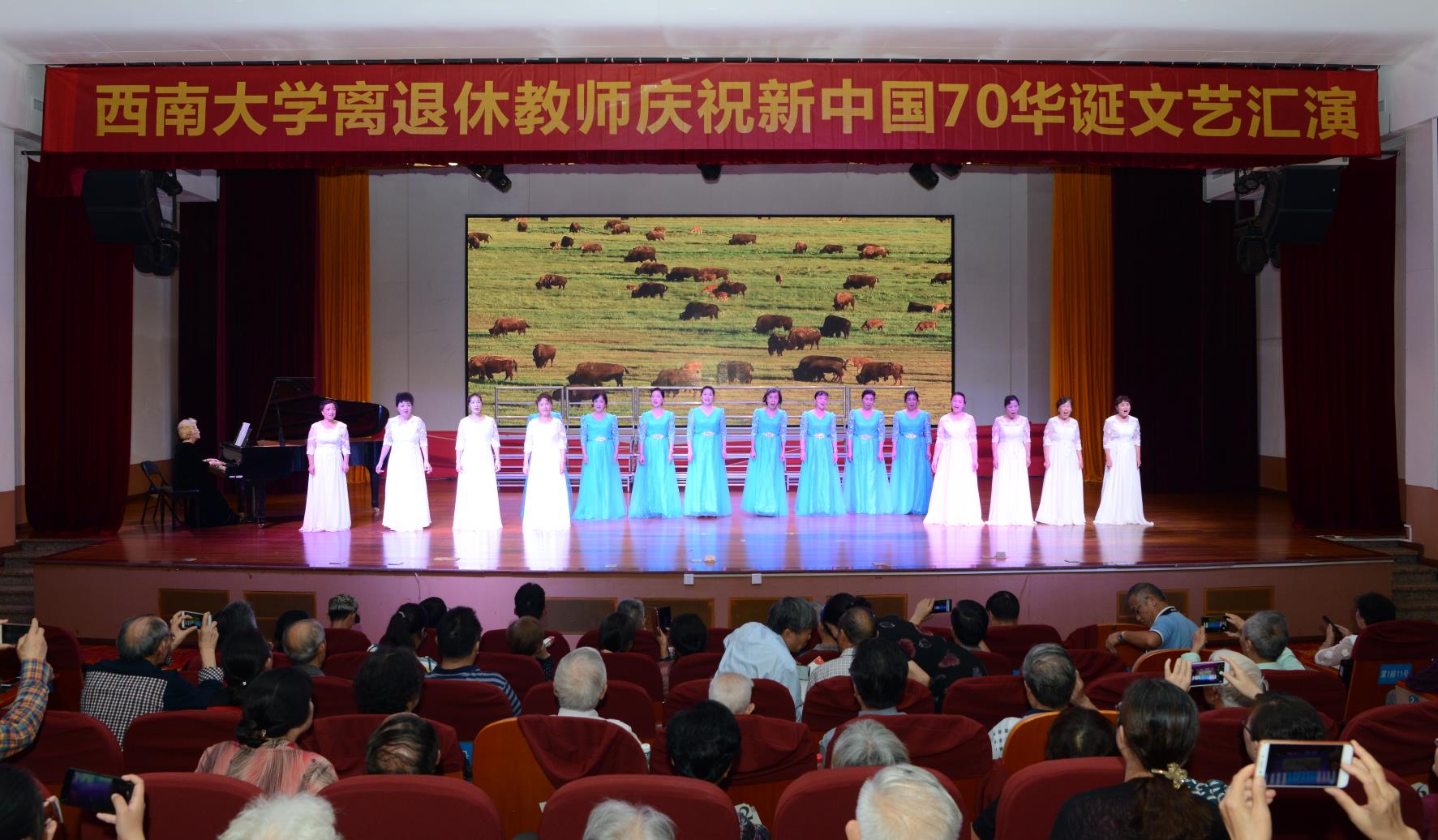 山河为证,岁月如歌。为庆祝新中国成立70周年,由学校党委宣传部主办,关心下一代工作委员会、离退休处协办,中国老教授协会会员单位bat365正版唯一官网老教授协会,重庆老年高等教育工作者协会bat365正版唯一官网分会承办的“bat365正版唯一官网离退休教师庆祝新中国70华诞文艺汇演”9月26日下午在音乐学院演奏厅举行。学校党委副书记安春元、关工委常务副主任宋乃庆、原西南师范大学党委副书记王运章出席活动,学校相关部门负责人、离退休教师代表和学校师生共500余人观看演出。