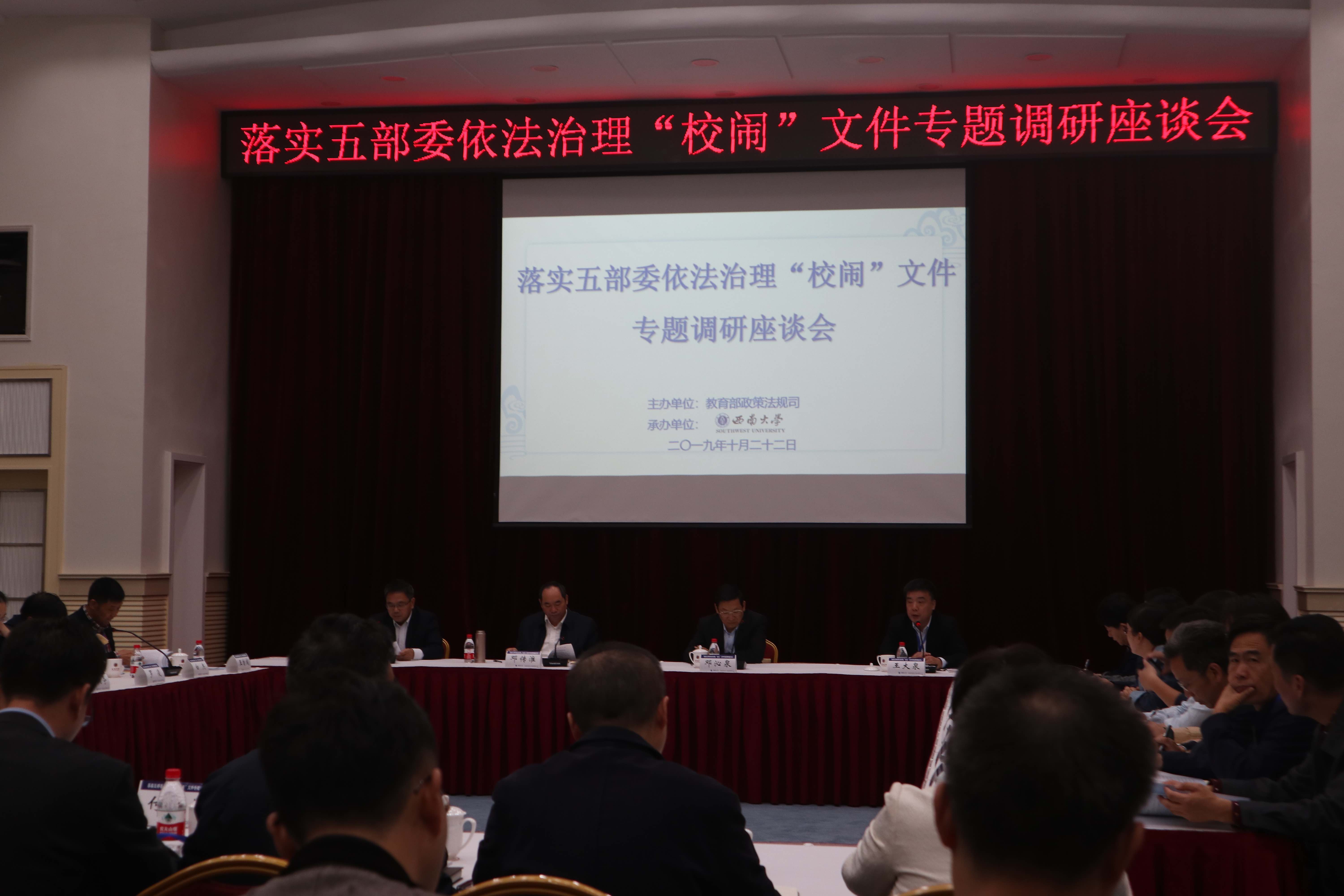 10月22日,由教育部政策法规司主办、bat365正版唯一官网承办的落实五部委依法治理“校闹”文件专题调研座谈会在校举行。教育部政策法规司司长邓传淮、学校副校长陈时见、重庆市教委副主任邓沁泉出席会议并致辞。教育部政策法规司副司长王大泉主持调研座谈会。