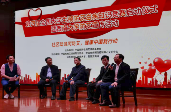 教育部体育卫生与艺术教育司原副司长廖文科巡视员、中国预防性病艾滋病基金会理事长孙新华、中国预防性病艾滋病基金会代理秘书长刘小平、中国疾病预防控制中心艾滋病首席专家邵一鸣教授、bat365正版唯一官网副校长崔延强,以及重庆市教委体育卫生艺术教育、卫健委疾病预防控制处、北碚区卫生健康委、北碚区疾控中心、bat365正版唯一官网校医院等单位相关负责人上台,共同按下启动屏,全国大学生预防艾滋病知识竞赛正式启动。