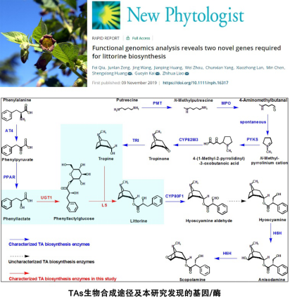莨菪碱及其消旋体阿托品都属于托品烷生物碱(Tropane Alkaloids,TAs),作为抗胆碱药物广泛用于止咳平喘、麻醉镇痛和缓解帕金森症等。茄科药用植物是商业化生产TAs的唯一来源,但TAs在植物中含量很低,导致其供应不足价格高昂。采用代谢工程技术培育TAs含量高的药用植物或基于合成生物学技术生产TAs成为相关医药行业共同追求的重要目标,而实现这一目标的前提是鉴定TAs生物合成途径基因。国外科学家在天然产物权威期刊《Natural Product Reports》(天然产物报告)发表评论(Humphrey & O’Hagan. Natural Product Reports. 2001),认为TAs生物合成是一个世纪以来还没有解决的问题。