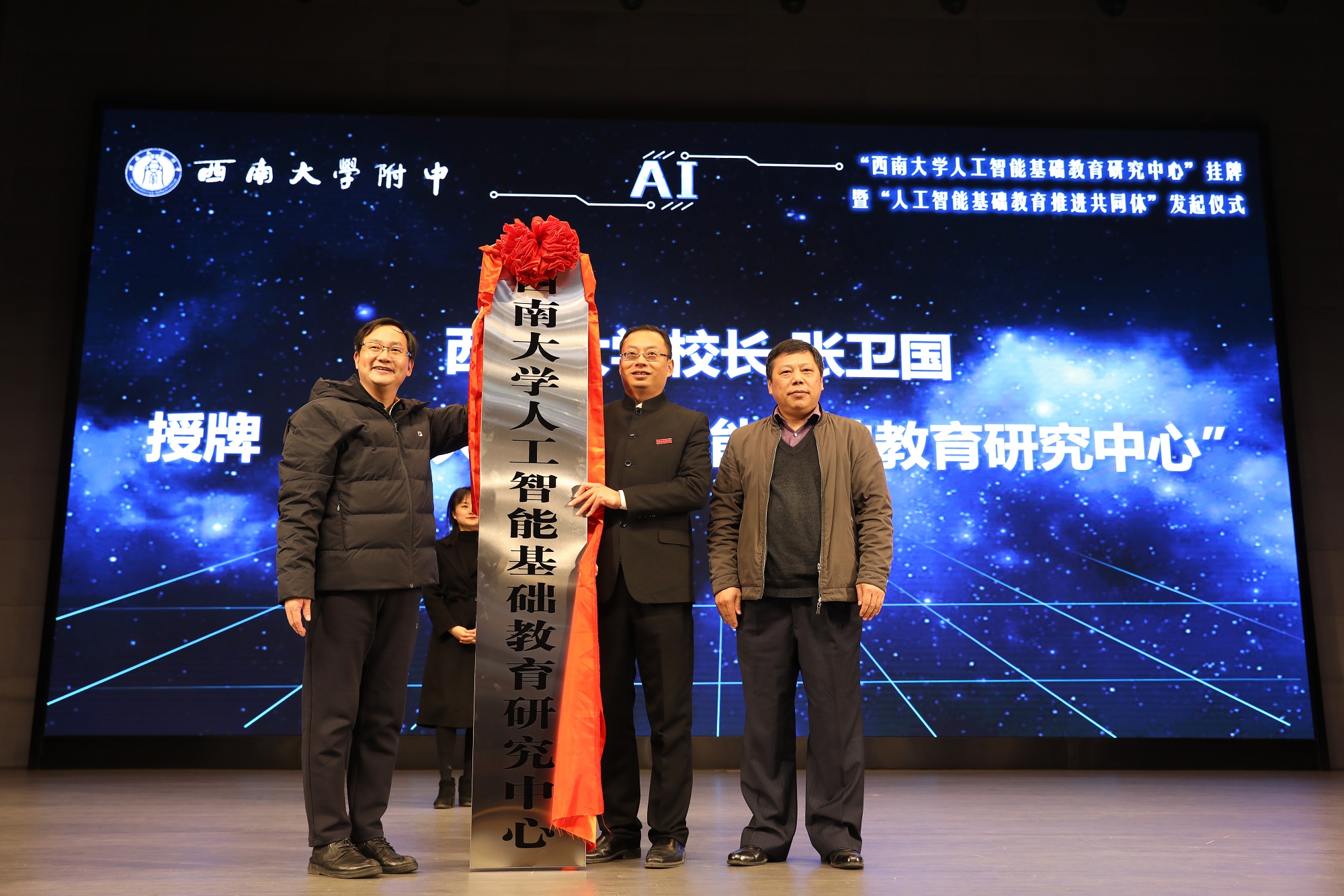 张卫国校长向人工智能学院副院长段书凯、附属中学校长欧健授牌“bat365正版唯一官网人工智能基础教育研究中心”。