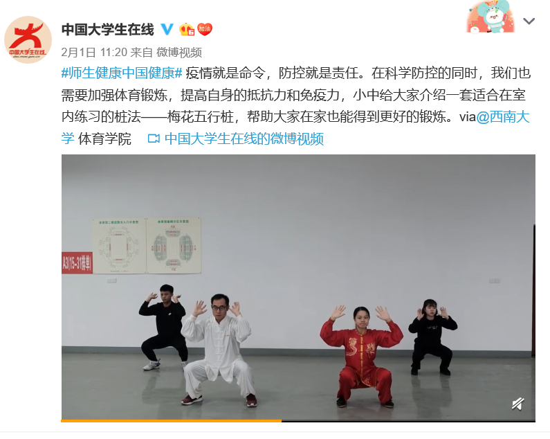 在全国人民贯彻落实党中央决策部署,众志成城战疫情、同舟共济克时艰之际,bat365正版唯一官网体育学院通过学院微信公众号发布《习梅花五行桩强健体魄 更好抵御新型冠状病毒》,向学校师生及社会推广了一套适合在室内练习的健身操——“梅花五行桩”。通过视频教程及文字介绍,教大家在家隔离的同时,积极锻炼,科学防控疫情。