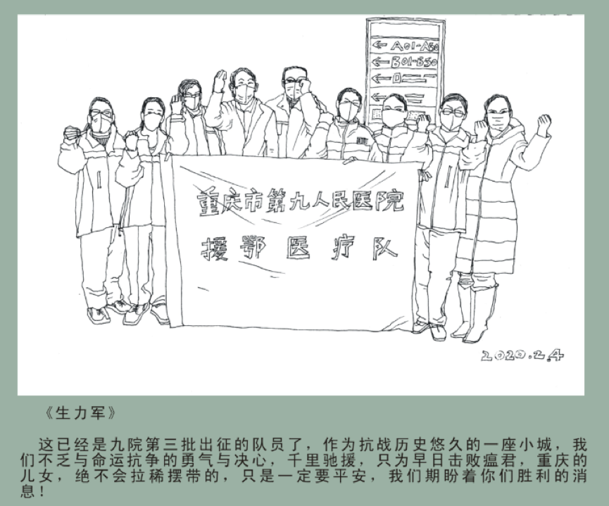bat365正版唯一官网美术学院副教授唐楚孝的一张画近日被重庆市第九人民医院收藏了。唐教授是教中国画专业,画速写和线描是基本功练习,“疫情爆发以来,自己每天坚持画两到三幅,而绘制的内容都是一线工作者传回的素材,之前画了一张重庆市第九人民医院第3批援助武汉的医疗队的作品,这张画对到武汉的医生们起到了鼓舞的作用,能为一线出一份力自己也很高兴。”