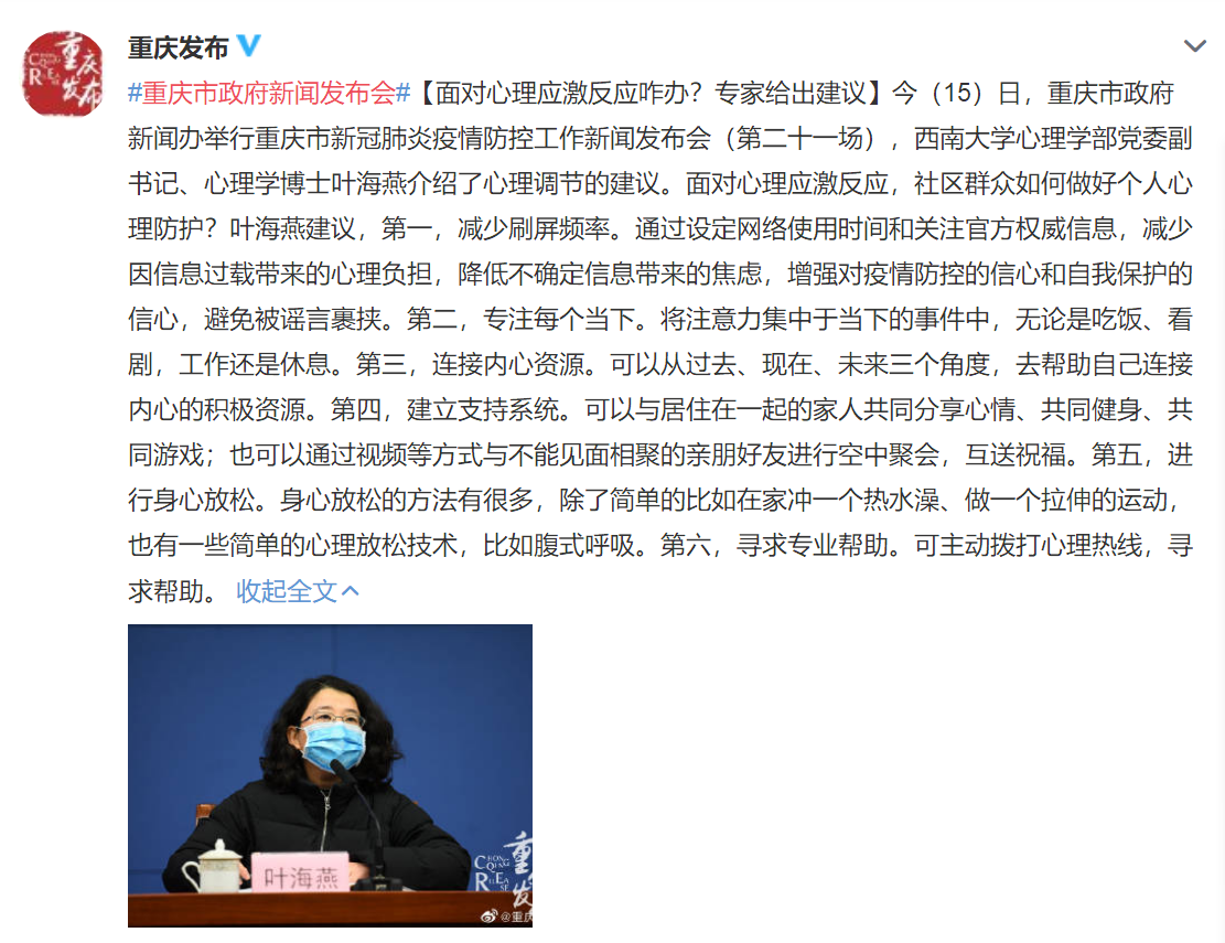 2月15日下午,重庆市召开第二十一场新冠肺炎疫情防控工作新闻发布会,市政府办公厅介绍了渝快办便民服务有关举措,市卫生健康委通报最新疫情态势,陆军军医大学医学心理系副主任杨国愉解读医护人员如何做好自我心理调适,bat365正版唯一官网心理学部党委副书记叶海燕解读社区群众如何做好个人心理防护。