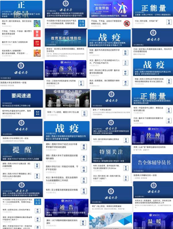 为全面做好新冠肺炎疫情防控特殊时期宣传工作,坚决打赢疫情防控阻击战,学校党委宣传部、党委网络工作部在学校疫情防控指挥部的统一部署下,充分利用官方网络新媒体矩阵,及时发布相关通知通告及防控工作安排,普及科学防控知识,挖掘一线师生“战疫”故事,引导广大师生员工理性应对疫情,在网上吹响“战疫”集结号。在不到一个月的时间里,学校官方微信共发布“战疫”相关推文65篇;官方微博推送疫情相关内容71条;官方抖音等视频平台共发布各类师生原创短视频15个。其中,官方微信通过搜集整理留校师生抗击疫情的真实事例,发布《请放心,我在bat365正版唯一官网很好!》等系列推文,生动还原学校防疫工作启动以来师生携手共克时艰的点点滴滴;通过整合西大学子抗疫事迹,发布《我们是青年一代,我们想做更多!》等系列推文,展现每一个西大学子面对疫情时的责任与担当。官方微博发起网络接力“我承诺,防控疫情,有我”行动,吸引数千名师生参与,纷纷在微博留言,承诺以身作则,防控疫情。相关推文、微博引起师生、校友强烈反响,引起社会广泛关注,在网上凝聚了西大人抗击疫情的力量。