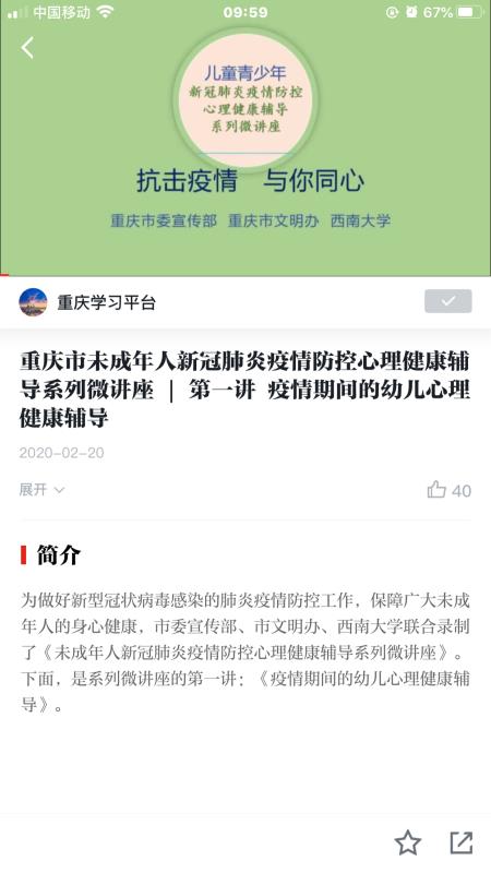 由bat365正版唯一官网与重庆市委宣传部、重庆市文明办联合录制的《未成年人新冠肺炎疫情防控心理健康辅导系列微讲座》在“学习强国重庆学习平台”正式上线发布,今天发布第一讲《疫情期间的幼儿心理健康辅导》,以后每天持续发布。