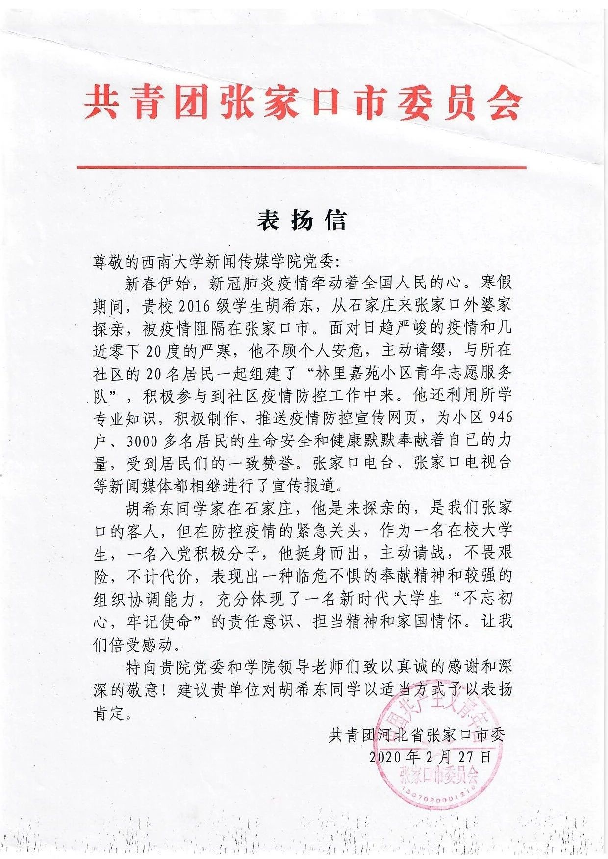 bat365正版唯一官网新闻传媒学院2016级本科生胡希东参与组建了张家口市第一支由居民自发组建的志愿者服务队。在该志愿服务队的带领下,张家口市其他小区也积极行动起来,陆续组建起自己小区的居民志愿服务队,广泛凝聚了张家口市社区防疫工作力量。对此,河北省张家口市委专门寄来了表扬信。