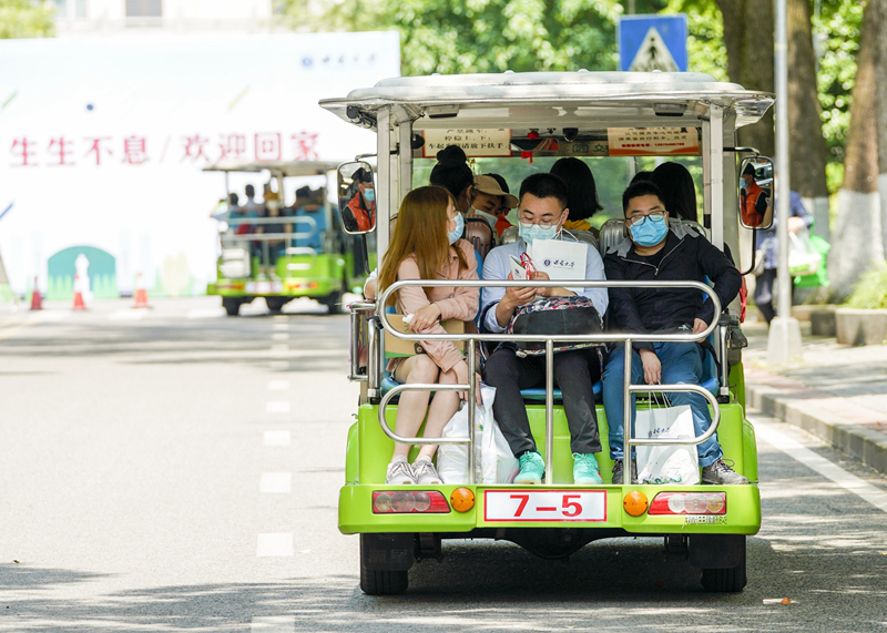 5月15日,在bat365正版唯一官网校园内,学生们搭乘校内转运车前往各自的宿舍。
