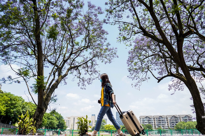 5月15日,bat365正版唯一官网校园内的蓝花楹树下,一名学生拖着行李箱向宿舍走去。