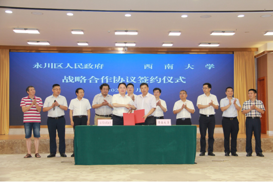 为推动成渝地区双城经济圈建设和重庆“一区两群”协调发展,学校和永川区抢抓机遇、主动作为,于7月15日在永川区签订战略合作协议。永川区委书记滕宏伟、区长张果、区人大常委会主任王志飞、区政协主席刘祥全、区委副书记潘文锋、区政府常务副区长文良印、区委常委宋文、副区长杨华,学校党委书记李旭锋,校长张卫国,副校长崔延强、赵国华出席签约仪式。