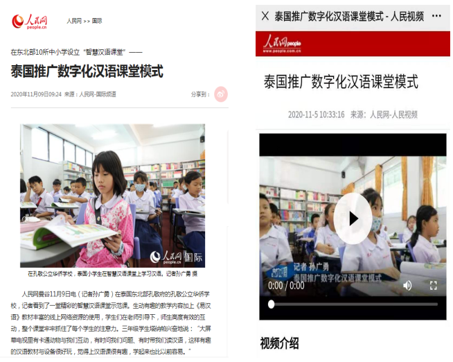 近日,人民网分别以视频、文字和图片等形式两次报道了学校出版社《易汉语》教材在泰国中小学校的推广、使用情况。报道介绍了泰国儿童对汉语和中华文化的喜爱,当地老师对《易汉语》立体化融媒体教材的赞赏。报道指出:生动有趣的教学内容加上《易汉语》教材丰富的线上网络资源的使用,在老师引导下,师生高度有效的互动,使整个课堂都牢牢抓住了每个学生的注意力。