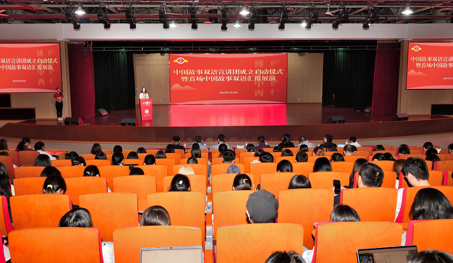 5月19日下午,外国语学院中国故事双语宣讲团成立启动仪式暨首场中国故事双语汇报展演在bat365正版唯一官网圆顶报告厅举行。bat365正版唯一官网党委常委、党委组织部部长李荣华,党委宣传部、外国语学院相关领导和师生代表,中国故事双语宣讲团指导教师代表及全体成员到场参加。