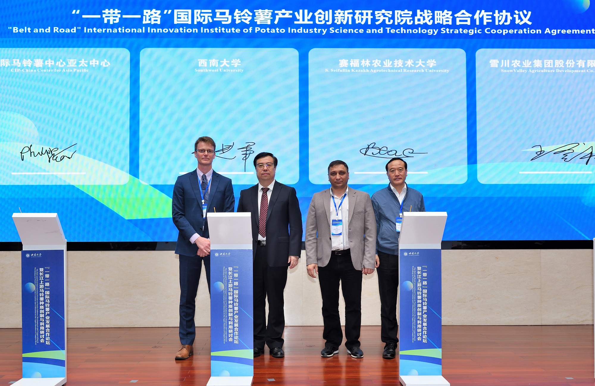 中国科学技术交流中心副主任庄嘉、学校副校长王进军、农业农村部人力资源开发中心副处长李厥桐等出席仪式。王进军、中国种子协会马铃薯分会会长王登社、国际马铃薯中心亚太中心国家联络科学家Philip James Kear博士、哈萨克斯坦塞弗林农业科技大学Vadim Khassanov教授代表各方签署合作协议。国家马铃薯产业体系首席科学家金黎平研究员、国际马铃薯中心育种部主任Hannele Lindqvist-Kreuze博士等人进行了倡议书发布。重庆市农业农村委员会二级巡视员周敏、中国科学技术交流中心欧亚处负责人万聪、中国西部(重庆)科学城种质创制大科学中心首席科学家夏庆友教授、中国种子协会原副会长兼秘书长李立秋等出席见证。