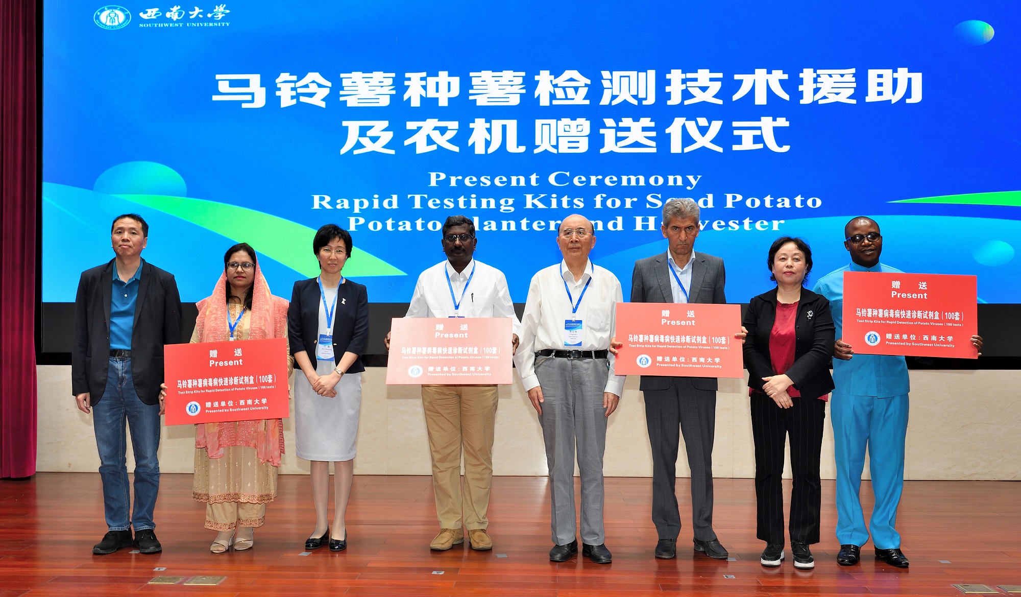 Vadim Khassanov教授代表校方致辞,Philip James Kear博士代表国际马铃薯中心致辞。随后,李厥桐致辞并宣读“一带一路”国际马铃薯产业科技创新院建设批复文件。各方代表就“一带一路”国际马铃薯产业科技创新院建设进行合作签约,并共同发布“一带一路”国际马铃薯种质资源库共建共享倡议书。校方代表向“一带一路” 国际马铃薯产业创新研究院共建国家代表赠送马铃病毒病快速检测试剂盒1000套以及马铃薯种植、收获农机各1台。