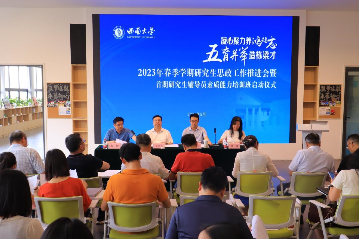为学习贯彻习近平总书记在中共中央政治局第五次集体学习时关于加快建设教育强国的重要讲话精神,进一步推进研究生思政工作,提升研究生辅导员素质能力,5月30日,学校在“青李空间”会议室召开“凝心聚力养鸿鹄志,五育并举造栋梁材”为主题的春季学期研究生思政工作推进会暨首期研究生辅导员素质能力培训“研行”班启动仪式。学校副校长王进军出席会议。各二级培养单位、研究生院 党委研究生工作部相关负责同志参加会议。