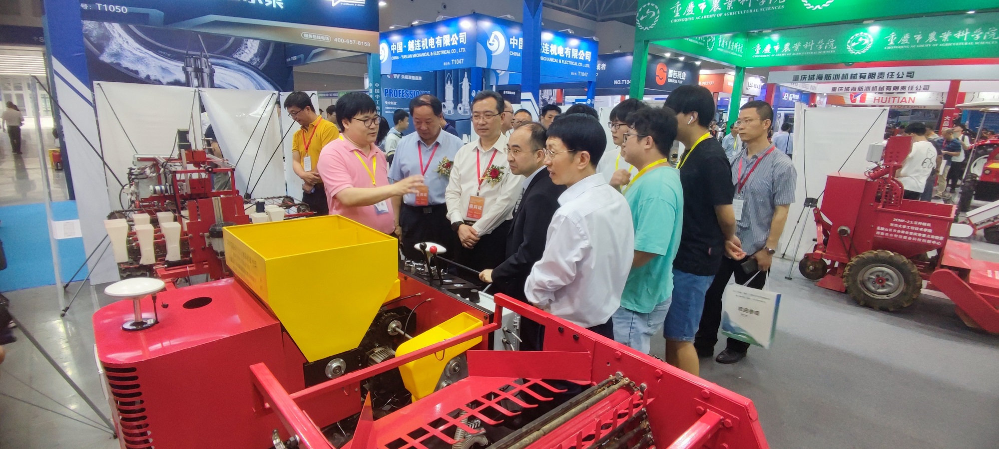 据统计,共有来自重庆、四川、浙江、湖南等19个省区市的255家农机企业、科研机构参展,展出面积1.8万平方米。展会上,工程技术学院通过实物、海报等形式展出种植、收获、农产品初加工、畜禽养殖等相关智能农机装备50余台/套,得到了重庆市农业农村委员会、重庆市经济和信息化委员会相关领导亲临展台指导与肯定。如为填补丘陵山区大豆玉米带状播种机械空缺所设计的集开沟、施肥、播种、覆土于一体的电控精量播种机,精度与效率高,受到重庆电视台《新闻联播》栏目报道。