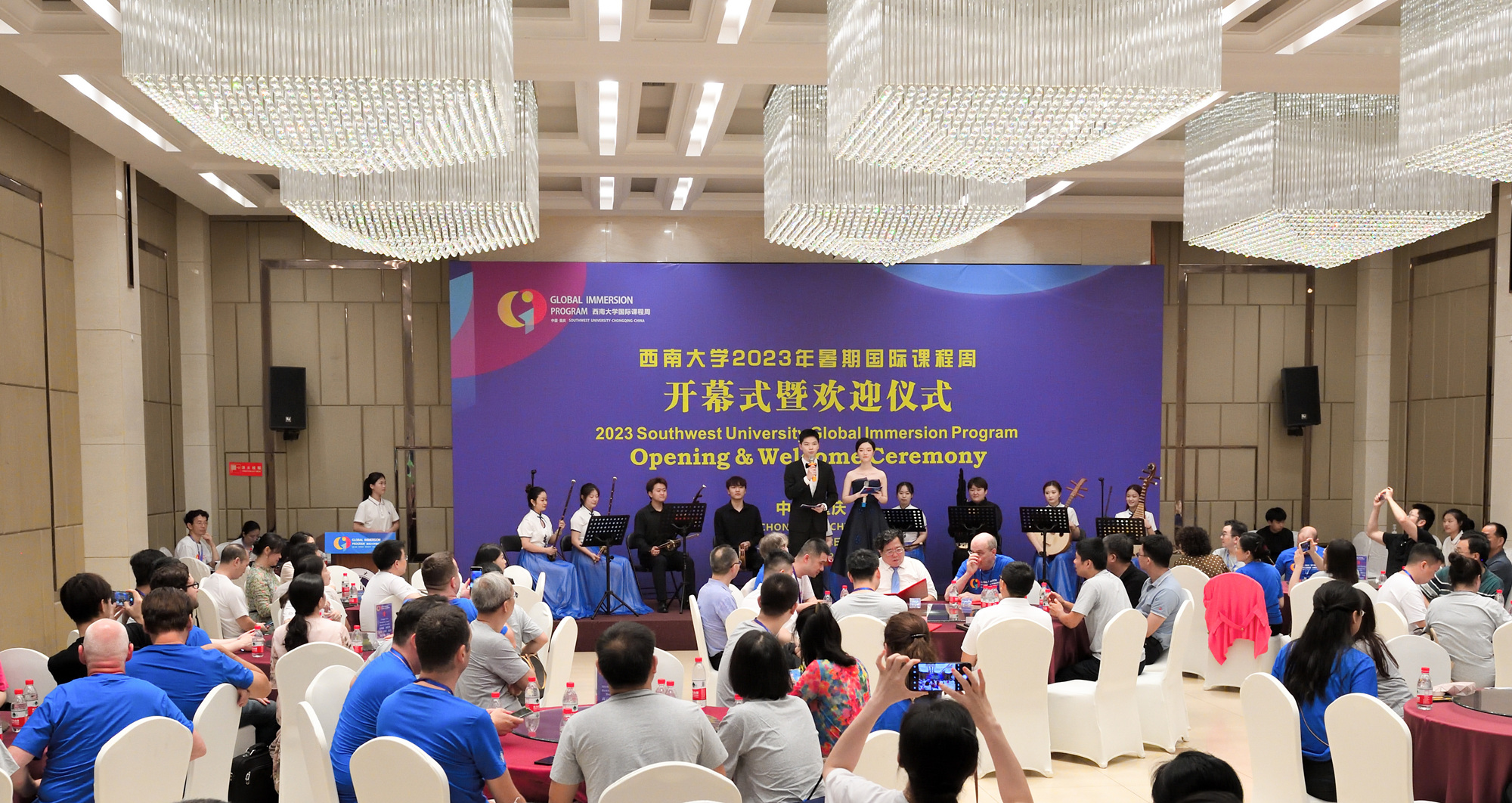 开幕式当天,音乐学院的师生们首先带来极具中国传统文化特色的民乐合奏《花好月圆》、竹笛合奏《喜相逢》和《民歌主题变奏曲》等节目,展现出多彩的中华民族传统文化,奏响了欢迎外国友人的美妙旋律。